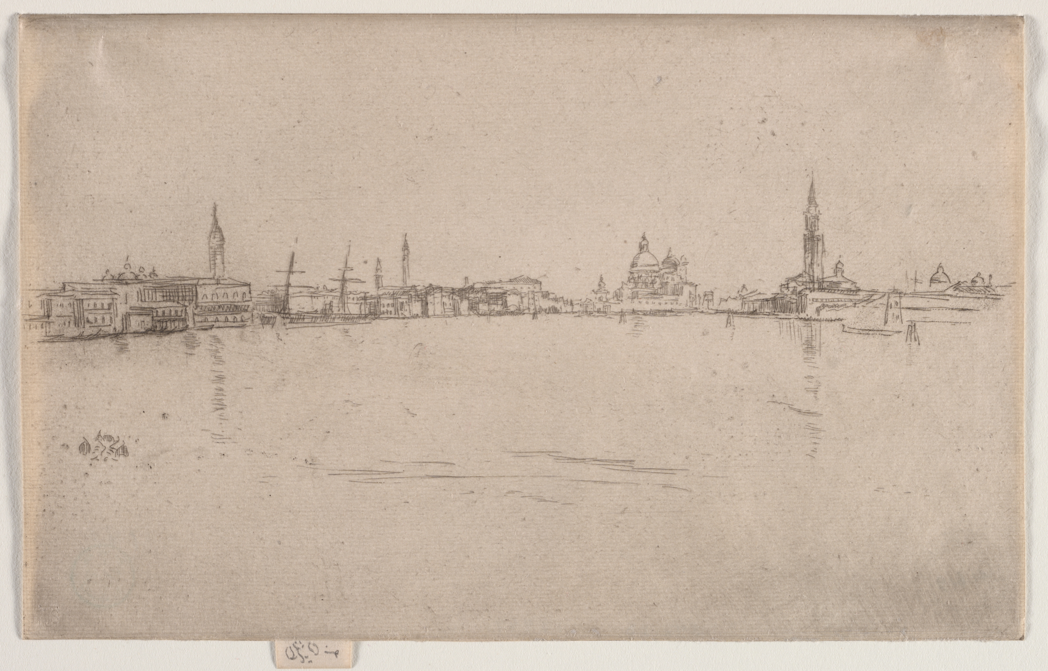 The image depicts a sketch of a waterfront cityscape. The artwork, titled "La Salute: Dawn," is rendered in a monochromatic color scheme, primarily featuring shades of brown on a rectangular piece of paper. The top two-thirds of the image showcase a city skyline, with buildings of varying heights and architectural styles. Notable features include several steeples and domes. The bottom third of the image represents a body of water, with gentle ripples depicted by short, horizontal lines. A small signature is visible in the bottom-left corner. The paper appears aged, with darker spots and a rough texture around the edges. A small piece of paper with numbers is placed below the artwork, set against a plain white background.