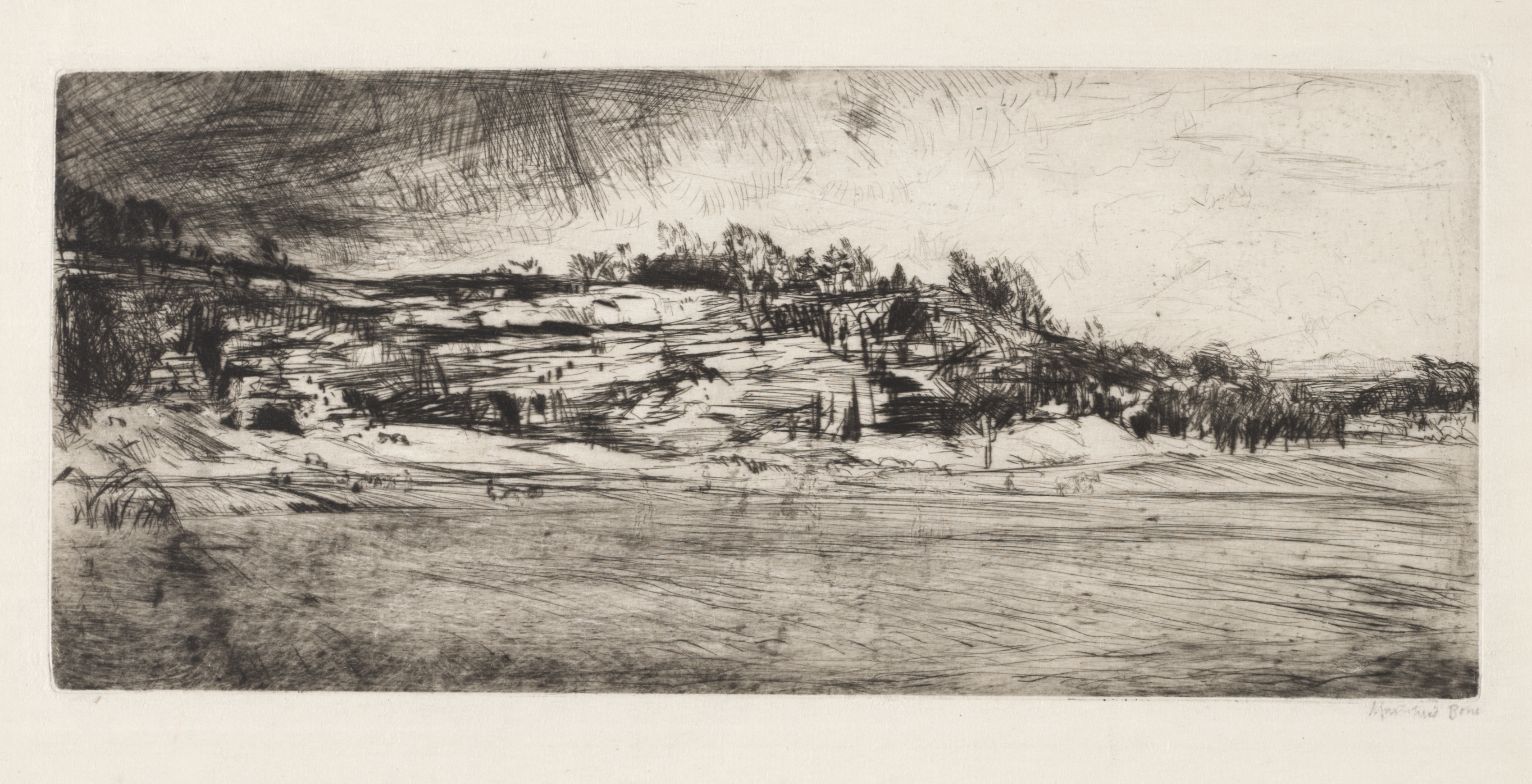 The image depicts a landscape drawing titled "Spring at Cardross" by Muirhead Bone. The drawing is in black and white. The scene shows a hillside with trees and bushes on the right side and a body of water in the foreground. The hillside appears to be layered with multiple levels. The body of water reflects the lines and shading of the sky and hills. The sky above is white with darker shading on the left. The entire image is presented on a white background. The drawing style is sketchy with many short lines. The artist's signature appears in the bottom-right corner.