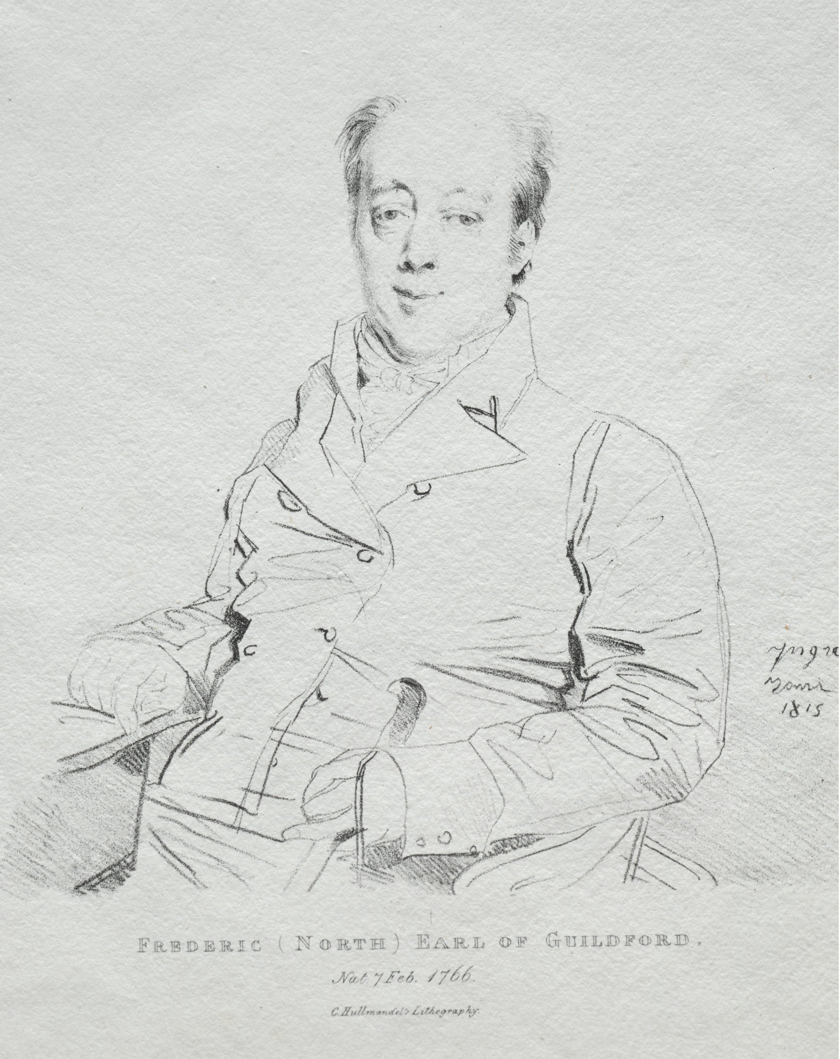 Black and white sketch of a man with short hair sitting on a chair. The man wears a buttoned up high-collared coat with lapels and cuffs. He has on a cravat around his neck. His right hand rests on his lap. The drawing is on off-white paper. The drawing shows shading and lines to create depth and texture. The man looks towards the left. There is a signature and date to the right of the man. There is typed text at the bottom of the paper. The text reads "FREDERIC ( NORTH ) EARL OF GUILDFORD. Nat. 7 Feb. 1766." There is more cursive text below but it is illegible.