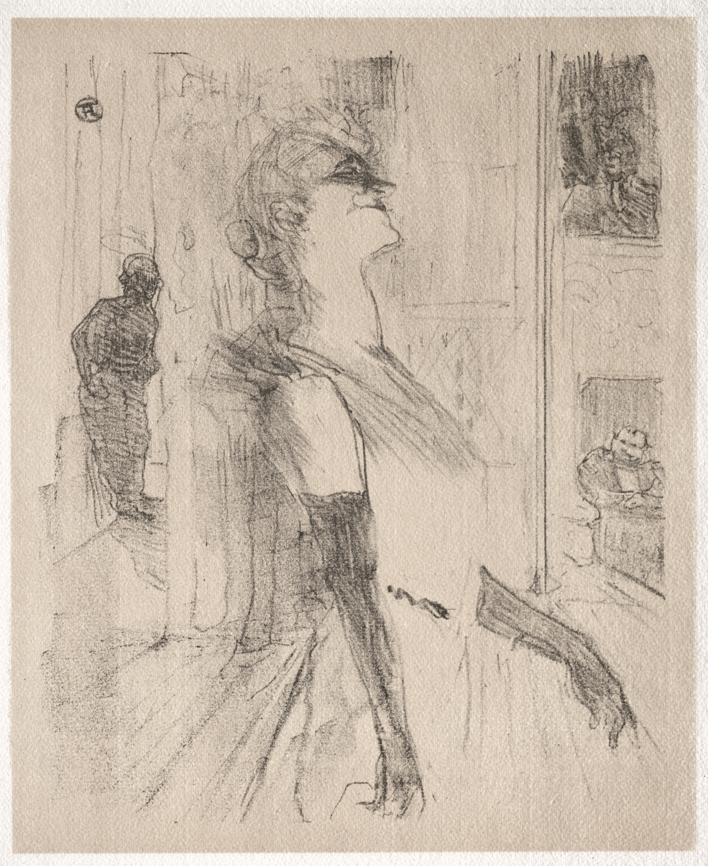 The image depicts a charcoal sketch of a woman. The woman's head is turned to the right. The woman wears a dress with a low neckline and long sleeves. The woman's left arm is straight down and her right arm is bent up. In the background, there are two other people, one standing and one sitting. The background appears to be an interior setting. The image is titled "Sur la scène" and is attributed to the artist Henri de Toulouse-Lautrec.