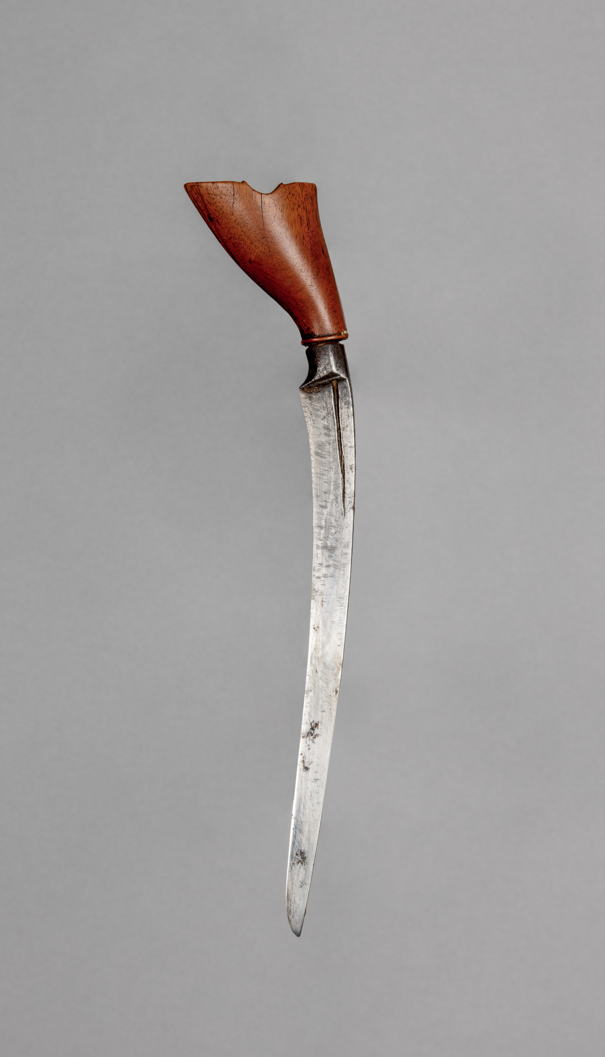 The image depicts a knife with a wooden handle. The knife features a curved blade that tapers to a point at the tip. The blade exhibits a silver-gray color with visible signs of wear and tear, including dark spots and discoloration. A small metal piece connects the blade to the handle. The handle itself is made of wood and has a smooth, brown finish. It is shaped like a triangle with a curved bottom edge, and the top right section appears to be chipped. The knife is positioned vertically against a solid gray background. The work "Knife (Kris)" by an unknown artist.