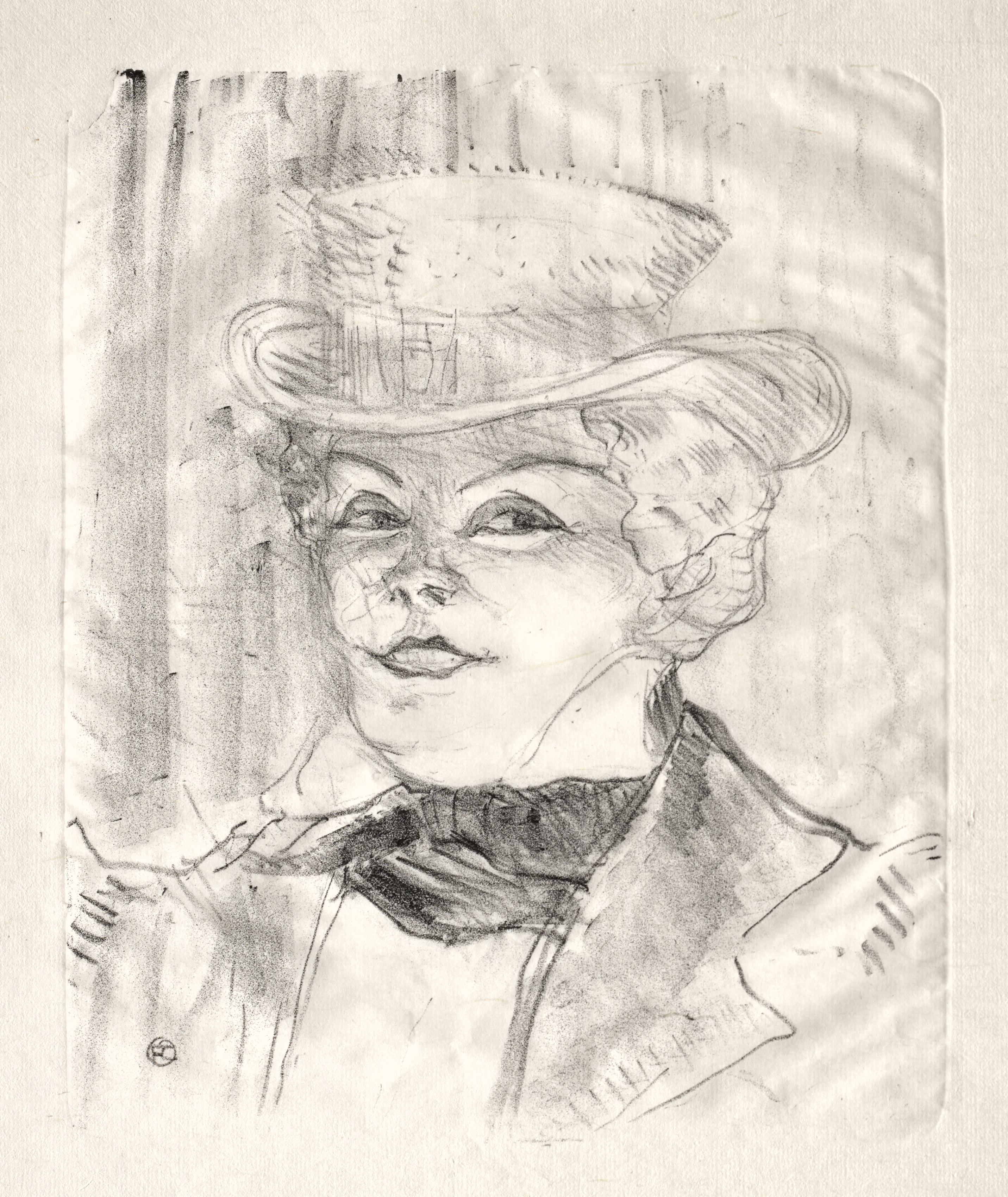 Black and white drawing of a woman's bust. The woman is wearing a light-colored hat with a narrow brim and a tall crown. Her hair is pulled back and appears to be short. She has a dark bowtie around her neck and a light-colored jacket. The background appears to be a curtain or drapes. The drawing appears to be on off-white paper.