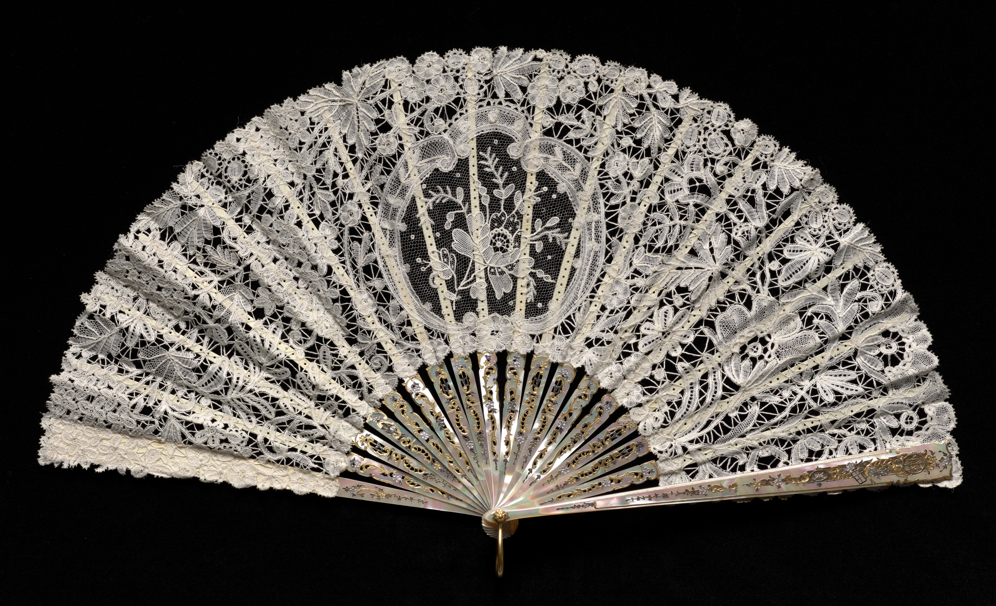 White fan with intricate lace design; floral patterns and geometric shapes; semicircular shape; gold-colored metal ribs and handle; mounted on a black background. Needlepoint and Bobbin (Point Duchesse) Fan.