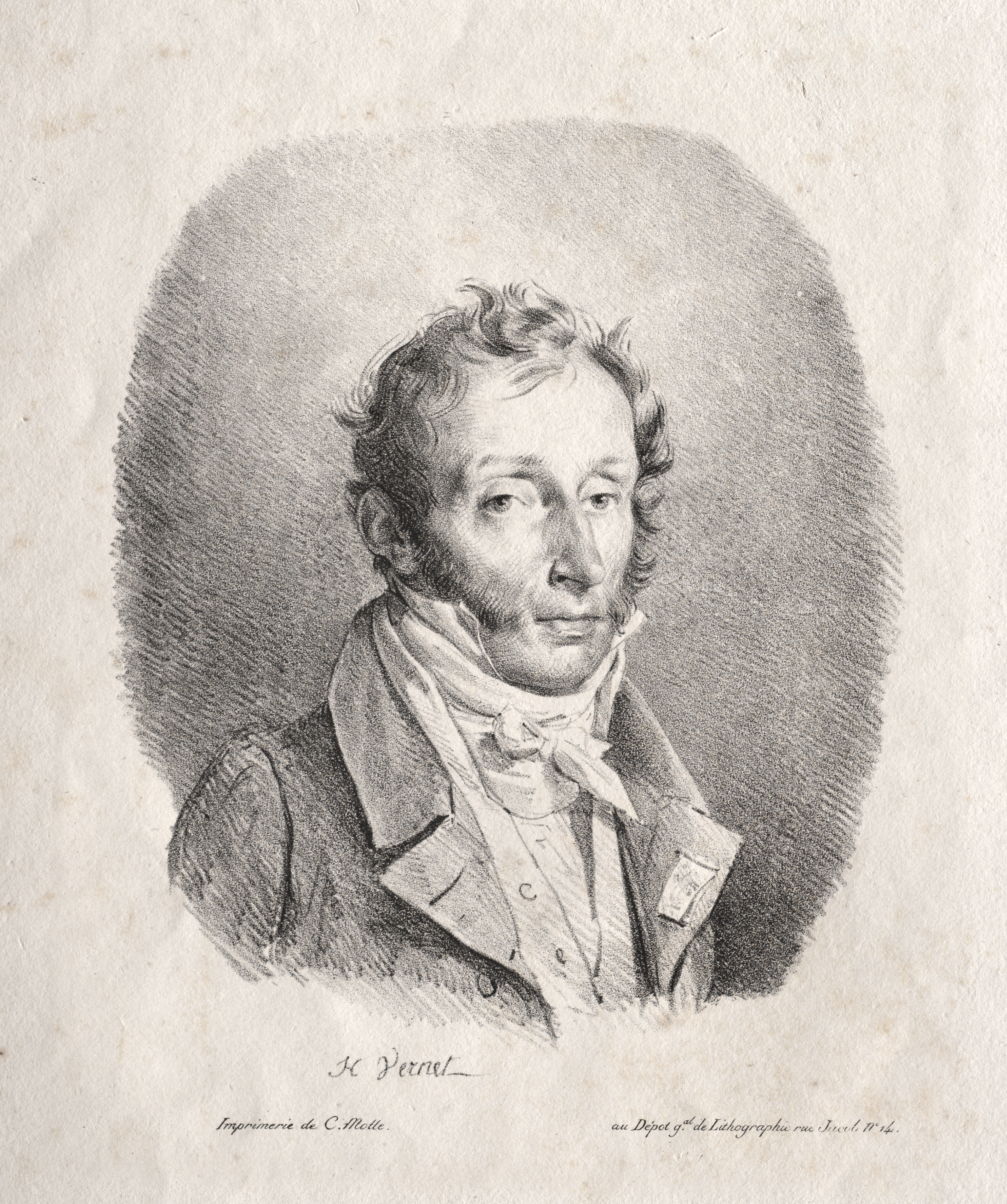 Black and white portrait drawing of a man with short curly hair, wearing a jacket and scarf. The man is centered in the image, shown from the chest up, looking to the right. He has a slight double chin and a small mustache. His jacket has a wide lapel and several buttons down the front. The scarf around his neck is tied in a bow. The background is a shaded oval shape. The image is on a beige background with darker spots and lines, indicating age. Text at the bottom reads "H. Vernet" and smaller illegible text.