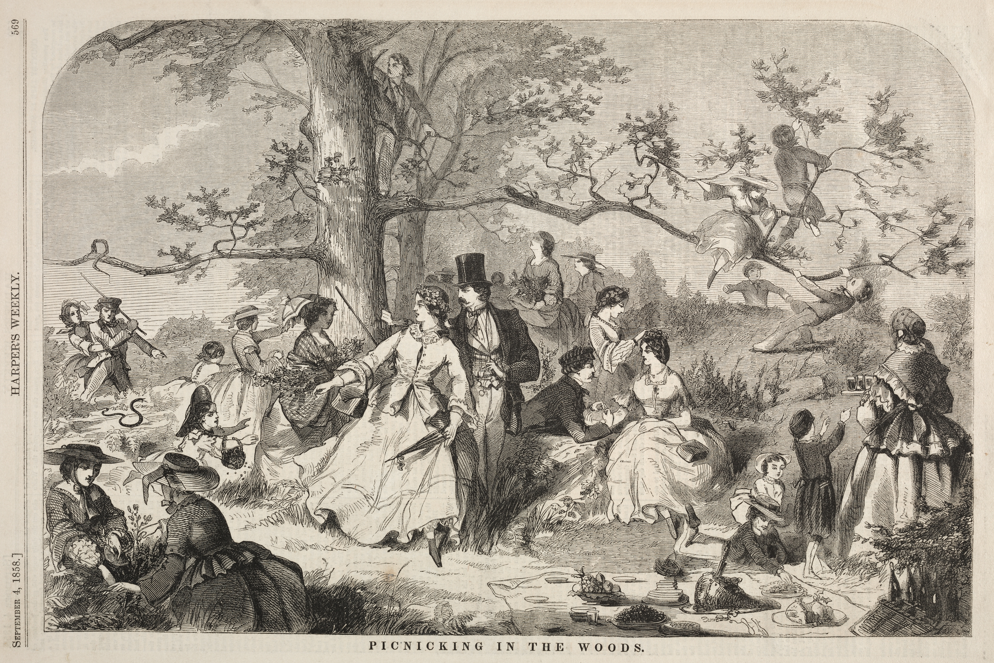 The image depicts a black and white illustration of a group of people picnicking in the woods. The group consists of men, women, and children, all dressed in 19th-century clothing, with the women wearing long skirts and dresses, and the men sporting top hats. They are gathered around a tree with a large trunk and sprawling branches. The foreground features a blanket or sheet spread on the ground with a picnic setup, including plates, food, and dishes. People are sitting and standing, with some playing and others socializing. A few individuals are climbing the tree, while others are on the ground. The scene is set against a backdrop of trees and a cloudy sky. The title "PICNICKING IN THE WOODS" is written at the bottom of the image.