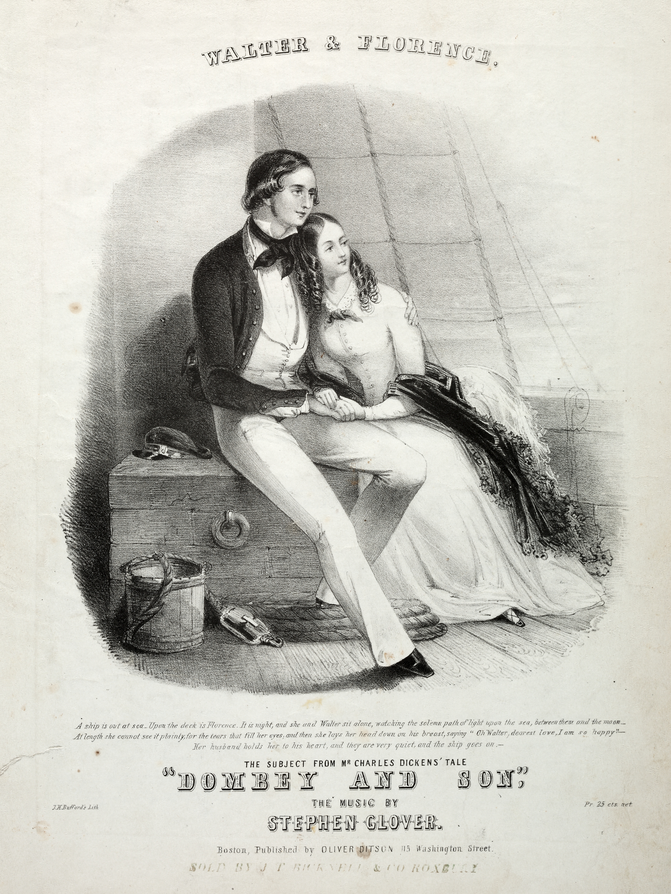 Black and white drawing of a man and woman sitting together on a chest. The man wears a white shirt, white pants, black jacket, and a black bowtie. He has his right arm around the woman's shoulders. The woman wears a long white dress. They sit on a wooden chest with a hat and a bucket beside them. A rope hangs behind them. Text at the top reads "Walter & Florence". Text at the bottom includes "Dombey and Son", "The music by Stephen Glover", and "From Mr. Charles Dickens' Tale".