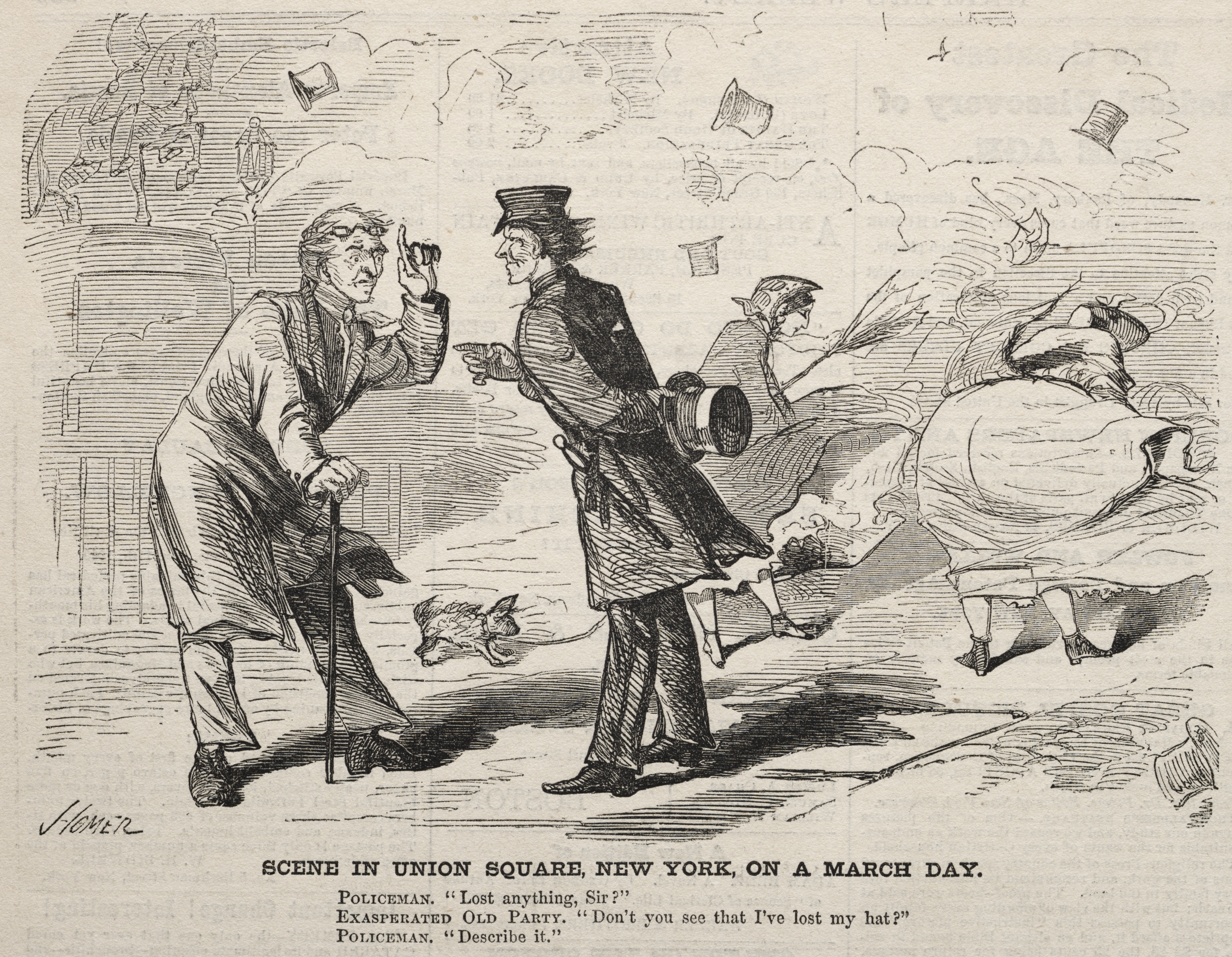 Black and white drawing of two men standing on a sidewalk. The man on the left is gesturing upward. He wears a coat, vest, long pants, and black shoes. He holds a cane. The man on the right wears a top hat, long coat with tails, and pants. The man on the right points. A dog runs in front of them. A third man sits on the curb to their right. Hats blow through the air. The background contains buildings and a horse. Text under the image reads, "Scene in Union Square, New York, on a March Day. Policeman. 'Lost anything, Sir?' Exasperated Old Party. 'Don't you see that I've lost my hat?' Policeman, 'Describe it.'"
