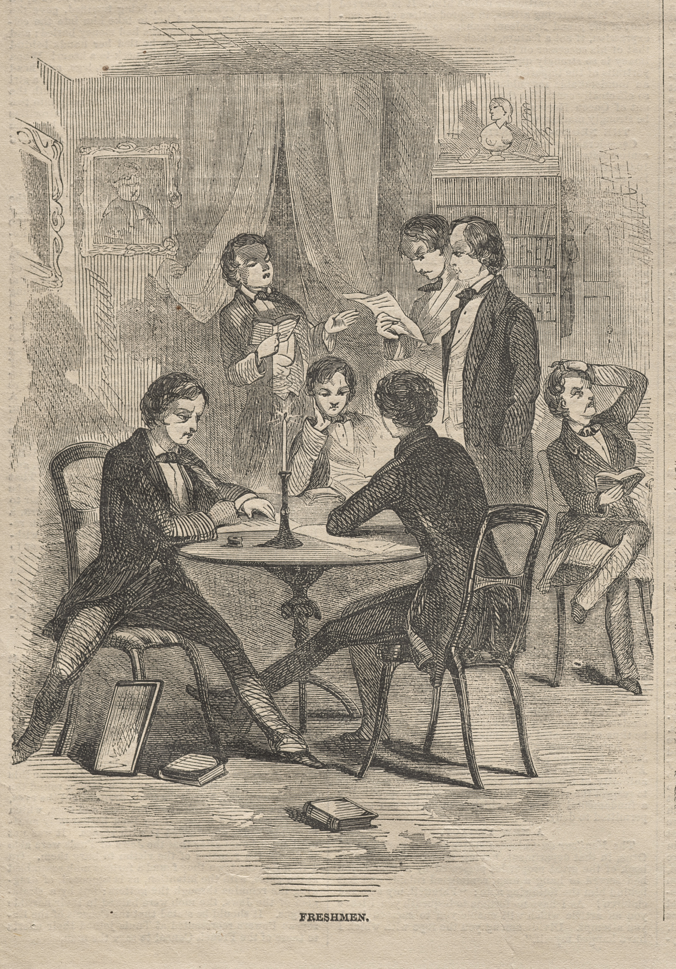 Black and white drawing of 7 men in suits in a furnished room. The men are indoors. Six men are in the foreground and one standing man is in the background. Two men are sitting at a table. Three men are standing. Two men are sitting on chairs. There are books on the floor. The table has a candle on it. The room has a mantle with a bust on top. There are two framed pictures on the wall. The title "Freshmen" is at the bottom. The image is by Winslow Homer.