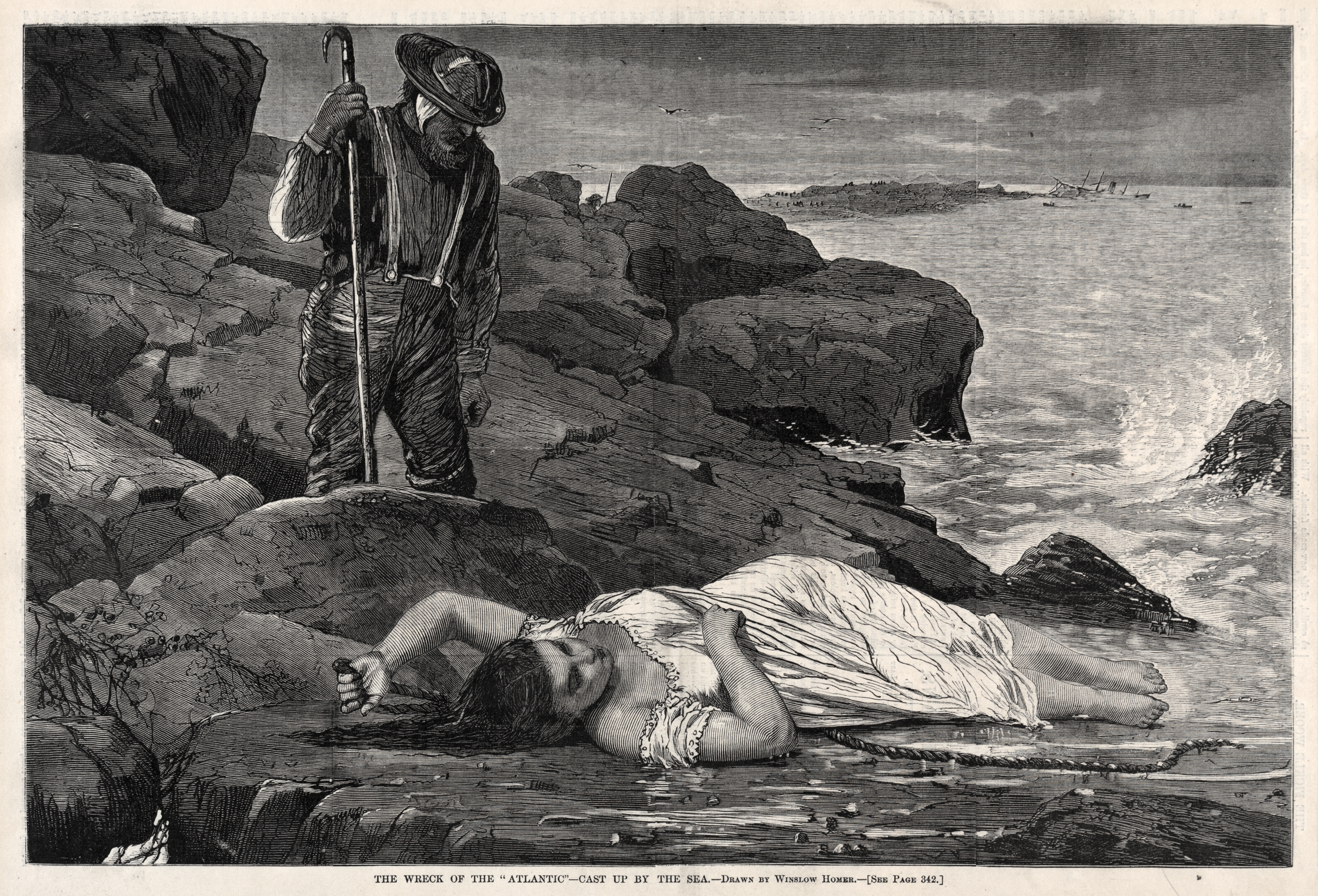 Black and white image. A woman lies on her back on rocky beach; she wears a long white dress; her left hand is on her chest, her right hand on her stomach; she has short dark hair; she looks up towards the sky. A man stands on rocks behind her; he wears a hat, dark overalls with straps, and holds a long-handled tool in his right hand; he looks down at the woman. Water with waves crashing on rocks and a shipwreck in the background. Title at bottom: The Wreck of the Atlantic.