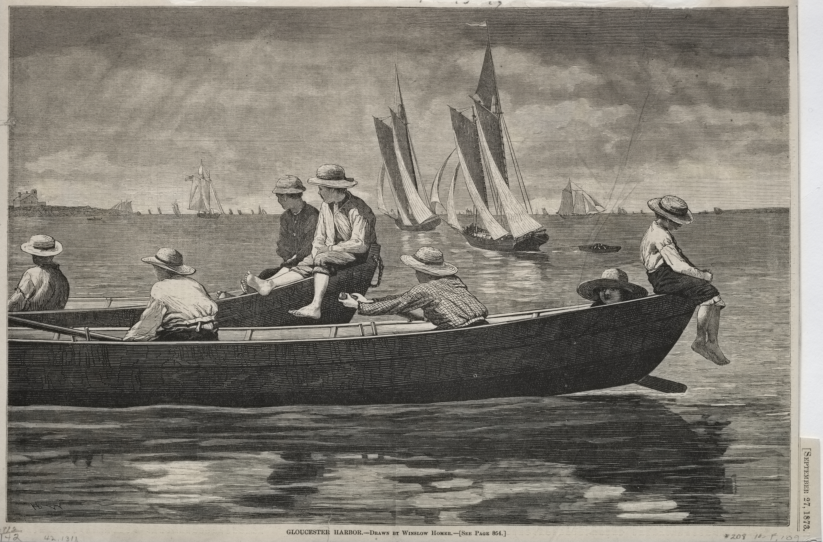 Black and white image of people sitting on a boat in the water. The boat they are sitting on is long and flat with a pointed bow. Six people are on the boat, four sitting inside, one sitting on the right side and one on the left side. The people are wearing hats and casual clothing, with two wearing long pants and one barefoot. The background shows a large body of water with several boats and a large ship with three masts. The sky is cloudy. The image is by Winslow Homer and titled "Gloucester Harbor".