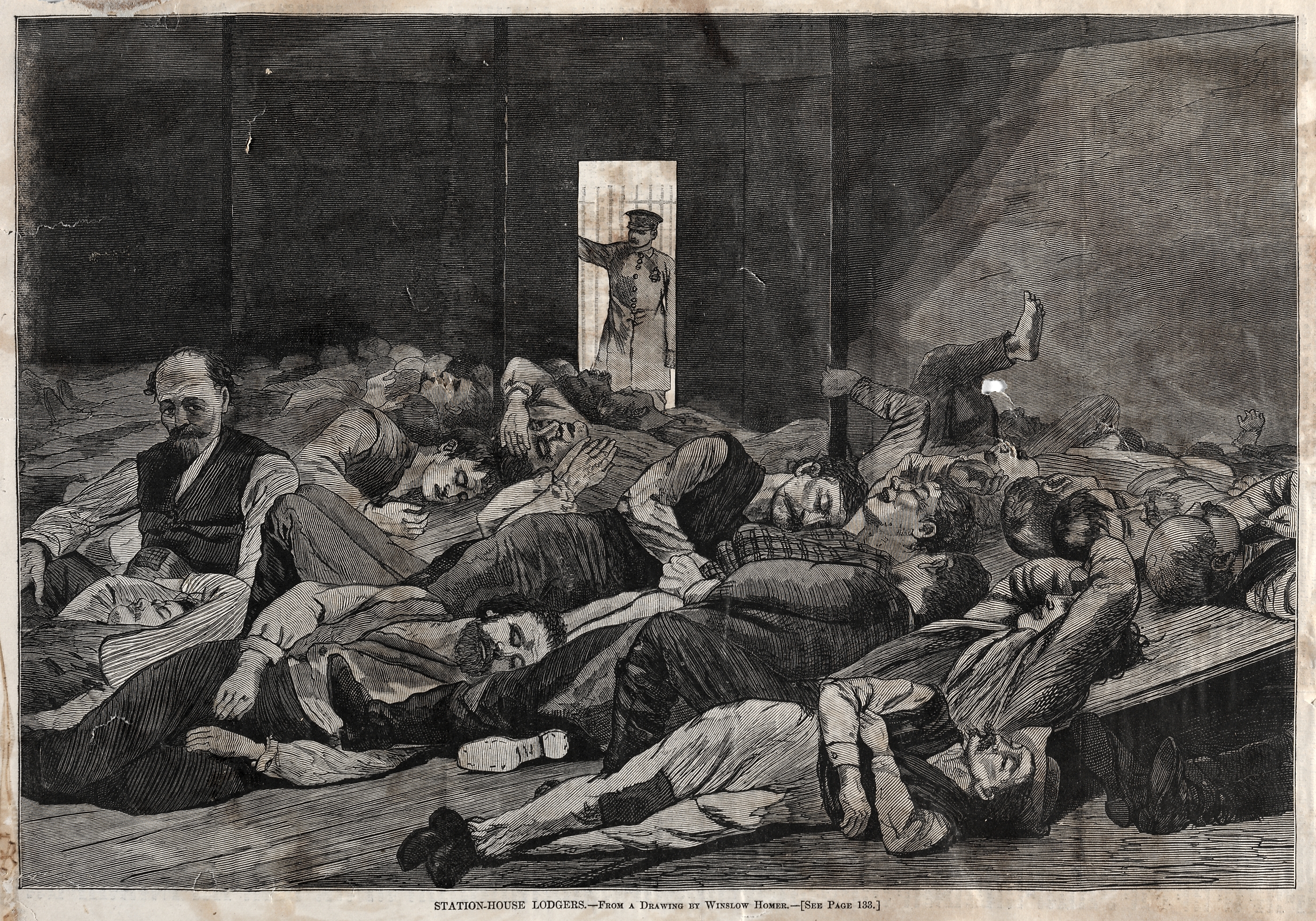 Black and white image depicts a crowded, dimly lit room with people sleeping on the floor and on benches. Men are scattered across the room, some sitting, some lying down. A man sits on the left, wearing a vest and white shirt. Most of the people are wearing dark clothing. In the background, a doorway shows a man in a uniform. The image is drawn with detailed lines, creating a textured effect. The overall mood appears somber and bleak. The image is titled "Station-House Lodgers" by Winslow Homer.
