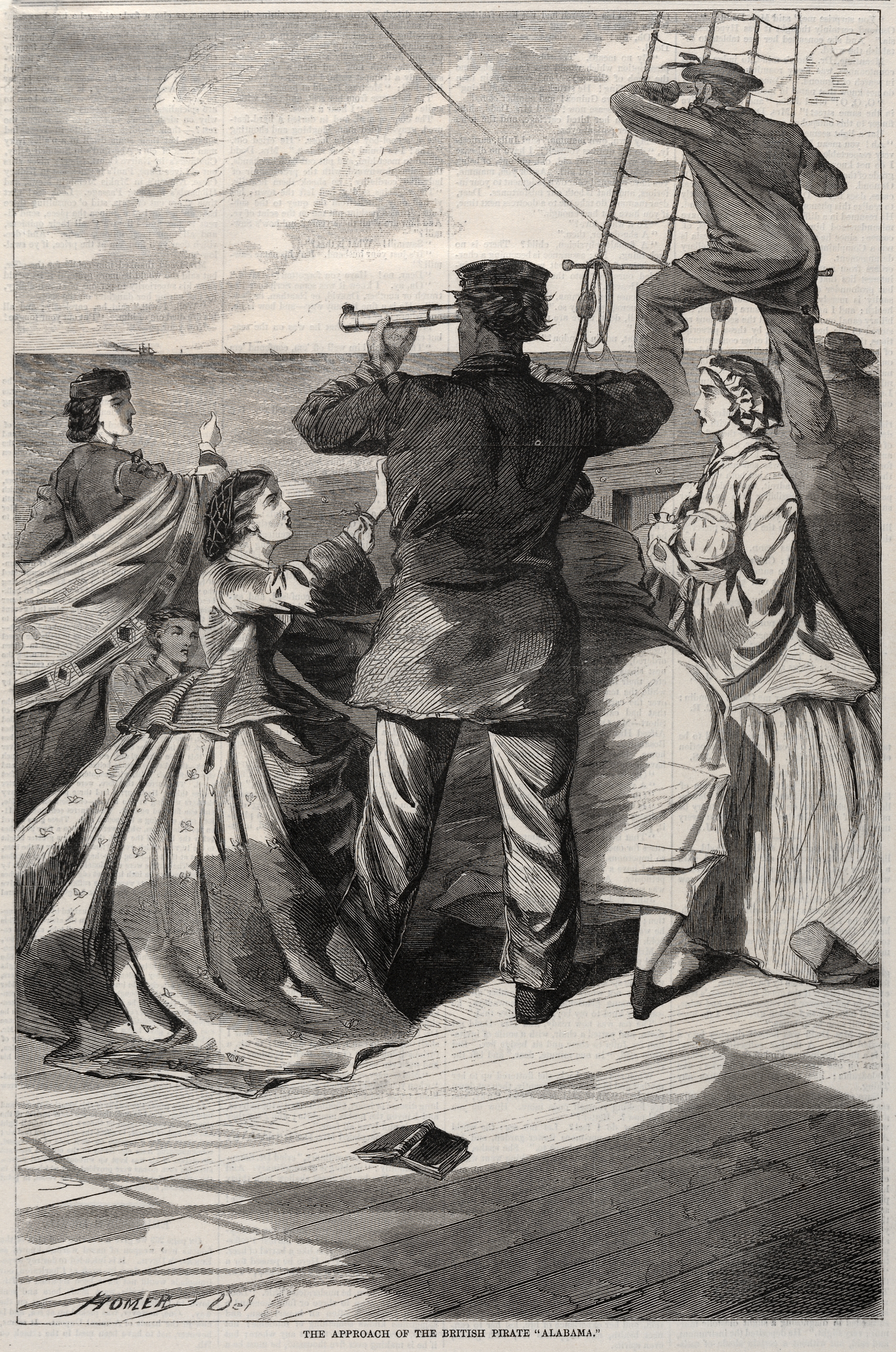 Black and white drawing of a man using a telescope; he faces away from viewer, wearing a uniform and hat. Two women stand on either side of him; the one on the left wears a floor-length dress with a floral pattern, hair in a bun, and looks through the telescope with him. The woman on the right wears a long white dress and looks out to sea. A man on the right ascends a ladder. A woman sits on the left. A ship is visible on the horizon. The sky has clouds. The title reads "The Approach of the British Pirate 'Alabama'".