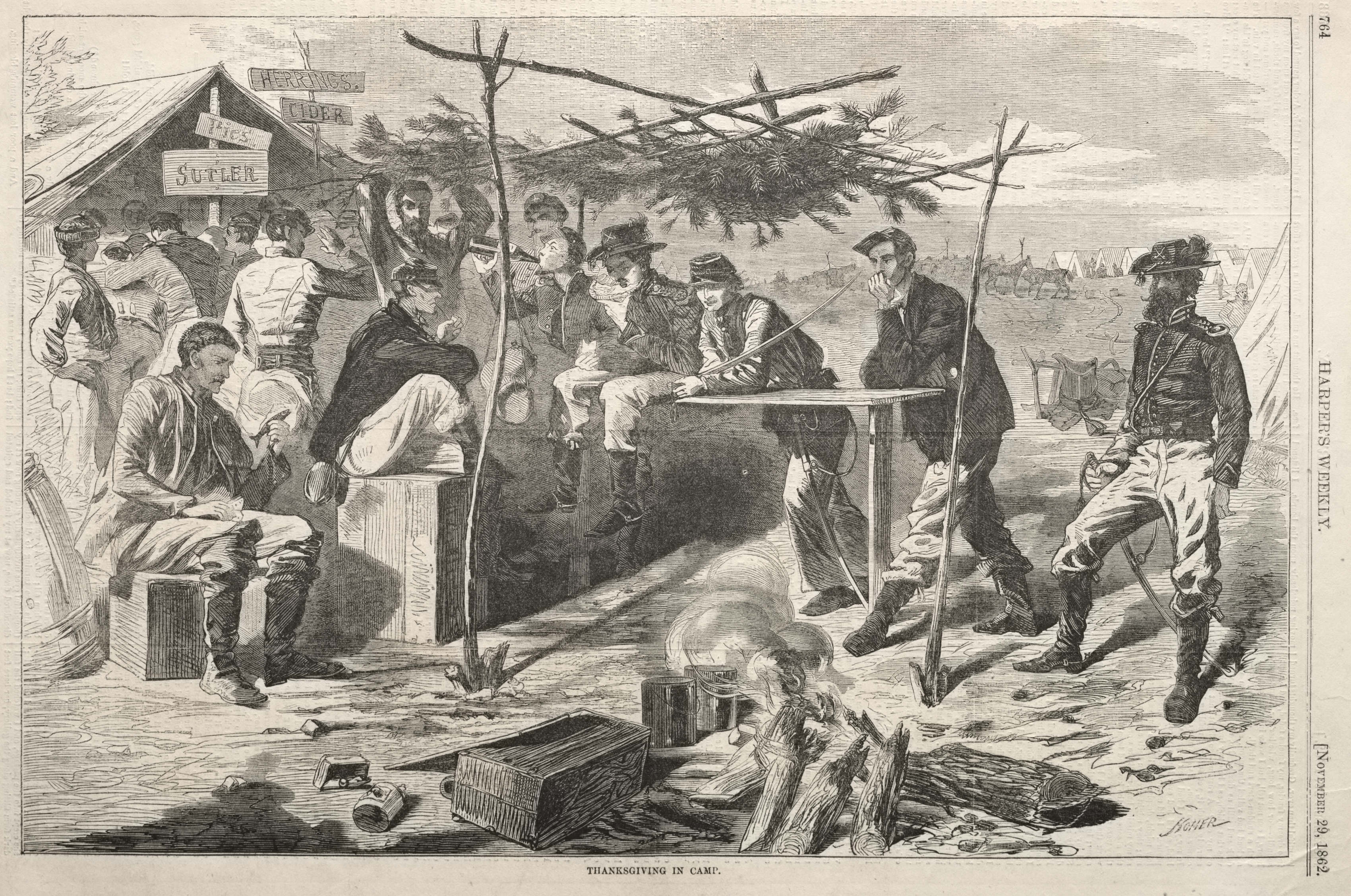 The image "Thanksgiving in Camp" by Winslow Homer shows a group of men in 19th-century clothing sitting and standing around in a military camp. Men are gathered around a makeshift table and a fire, with signs indicating a sutler's tent in the background. The men wear caps and jackets, some with epaulets. Most are casually dressed in light pants and boots. The men are either sitting on crates or wooden benches, or standing. The scene includes various objects like a fire pit with a kettle and pot over it, several wooden crates and a tree branch structure. The image background shows additional tents and a cloudy sky. The overall setting appears to be a rustic outdoor military camp during the 1860s. The image is rendered in black and white. The title is placed at the bottom center.