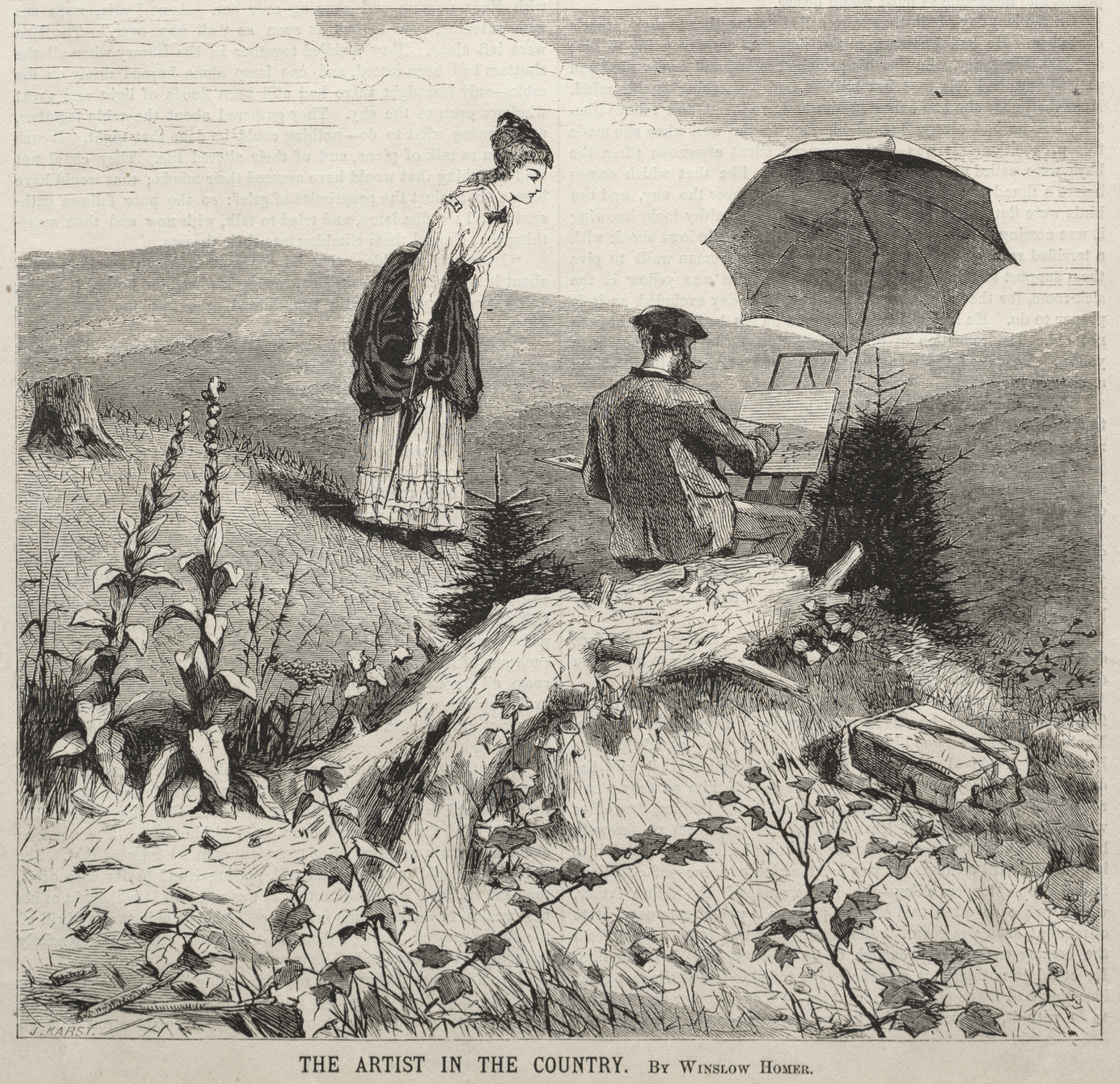 Black and white drawing of a man and woman outdoors. The man sits on a tree stump holding a paintbrush and painting on an easel. He wears a flat cap and jacket. An open umbrella shades the easel. The woman stands beside him on the left, wearing a long dress and shawl. She looks down. The man and woman face away from the viewer. The background shows a field and hills. The sky contains clouds. The foreground includes plants and a tree stump. A box lies on the ground beside the stump.