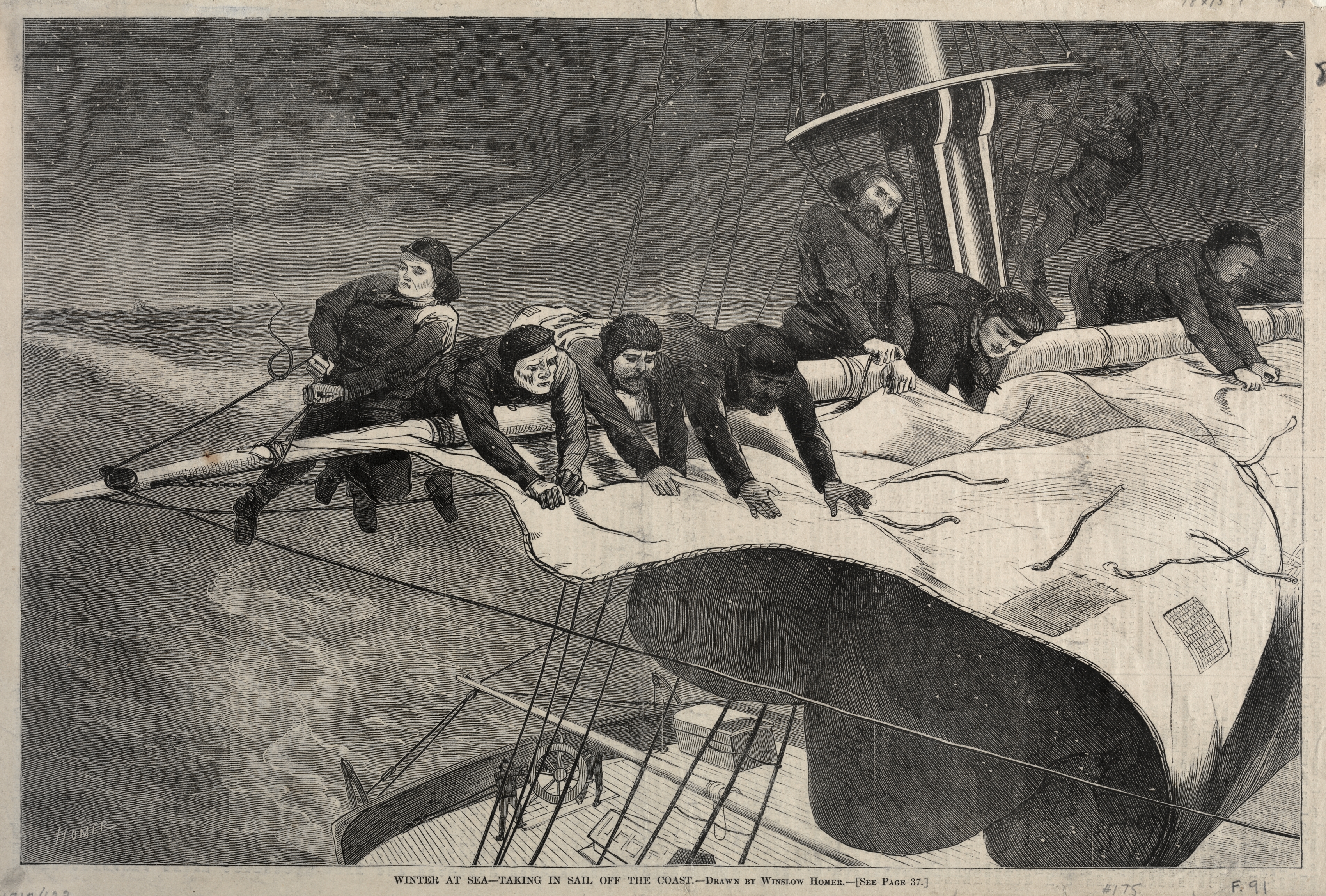 Black and white image of men on a ship. The men are on the deck of a ship with their bodies positioned horizontally and their hands on a sail. The men are wearing dark clothing. The background shows a body of water with crashing waves and a dark sky. The ship's deck is wooden with ropes and poles. The men are on the right side of the image, leaning over the edge of the ship to adjust the sail. The mood of the image appears to be one of hard work and harsh weather conditions. The image is titled "Winter at Sea - Taking in Sail Off the Coast" and was drawn by Winslow Homer.