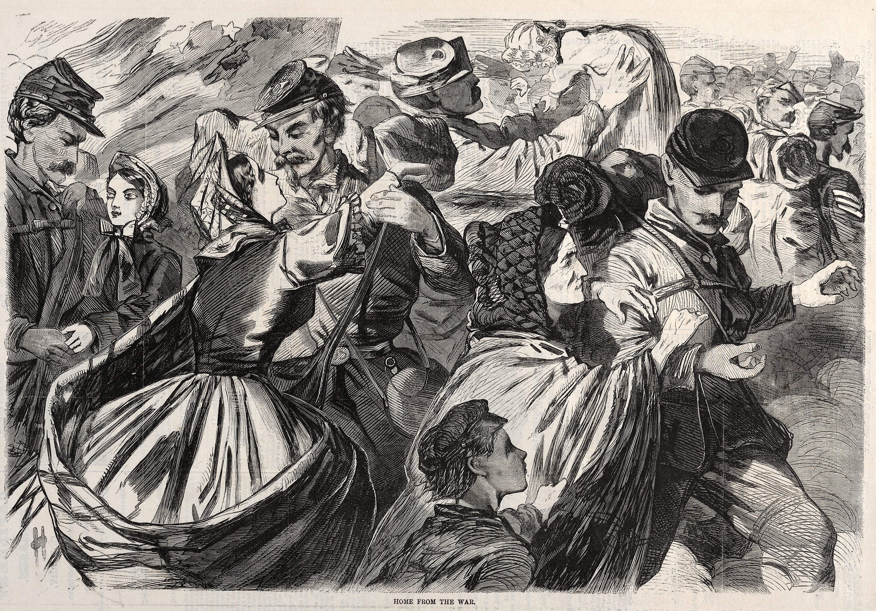 The image depicts a black-and-white illustration of a group of people in old-fashioned clothing. A man in a military uniform and cap is surrounded by several women and children, one woman wearing a headscarf and long dress appears to embrace him. A young girl stands beside a man on the left. In the background, there are more people, some wearing military uniforms and hats. The scene appears to be a reunion. The title "Home from the War" is at the bottom. The image is drawn in a detailed, realistic style with many lines and shading.