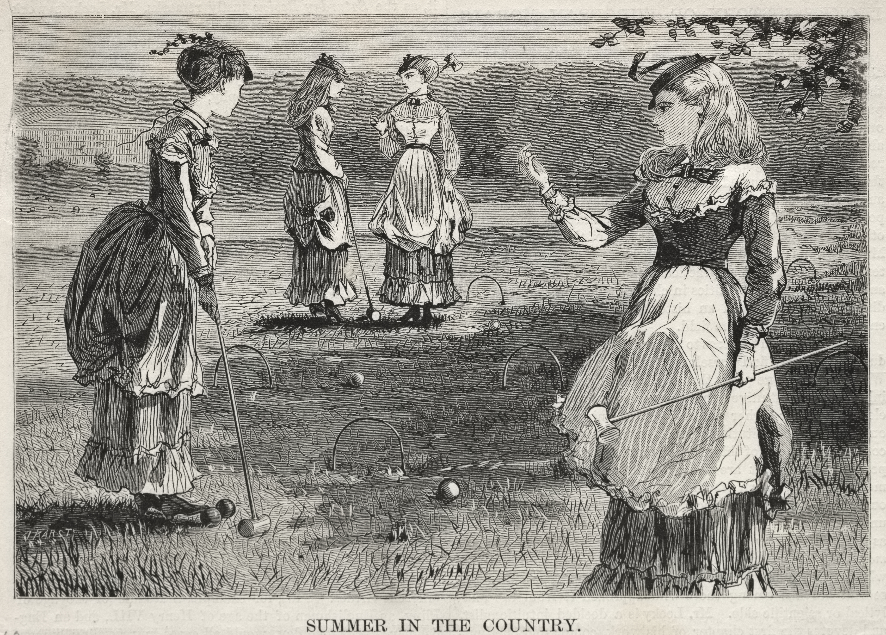 Black and white drawing of four women playing croquet. A woman in a long, dark dress with white underskirts faces right, resting a croquet mallet on her right shoulder. A woman on the right wears a dark top with a white apron over a long skirt and a hat; she looks left and holds a croquet mallet in her left hand raised. Two women stand in background. Trees are in background. Text at bottom reads "SUMMER IN THE COUNTRY".
