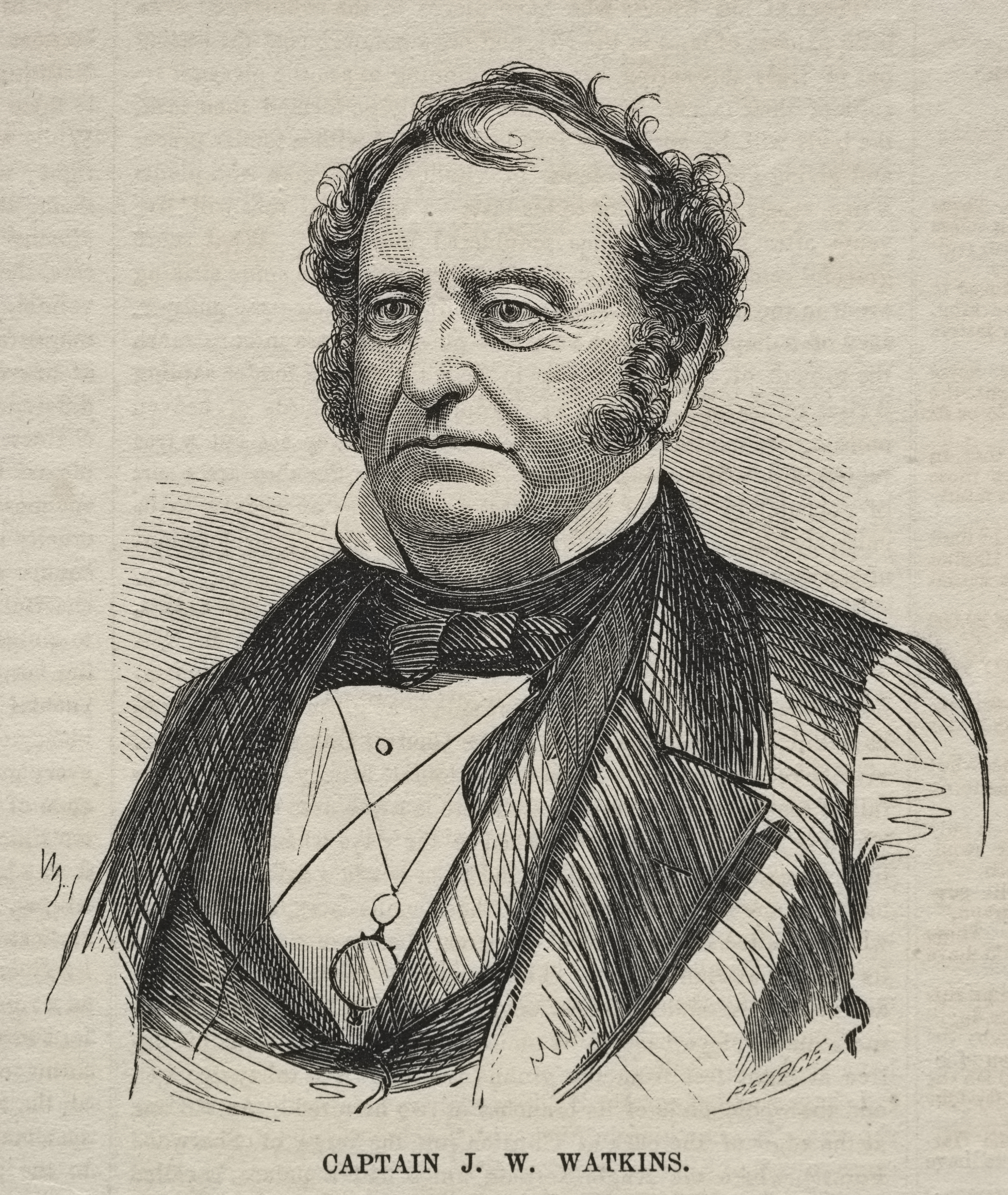 Black and white illustration of a man with curly hair wearing a suit. The man has a round face, small eyes, and thick sideburns. He wears a white collared shirt with a high, rounded collar and a black bowtie. A black vest covers the white shirt. The illustration is on a beige background and the words "CAPTAIN J. W. WATKINS" are printed below. The illustration is by Winslow Homer.