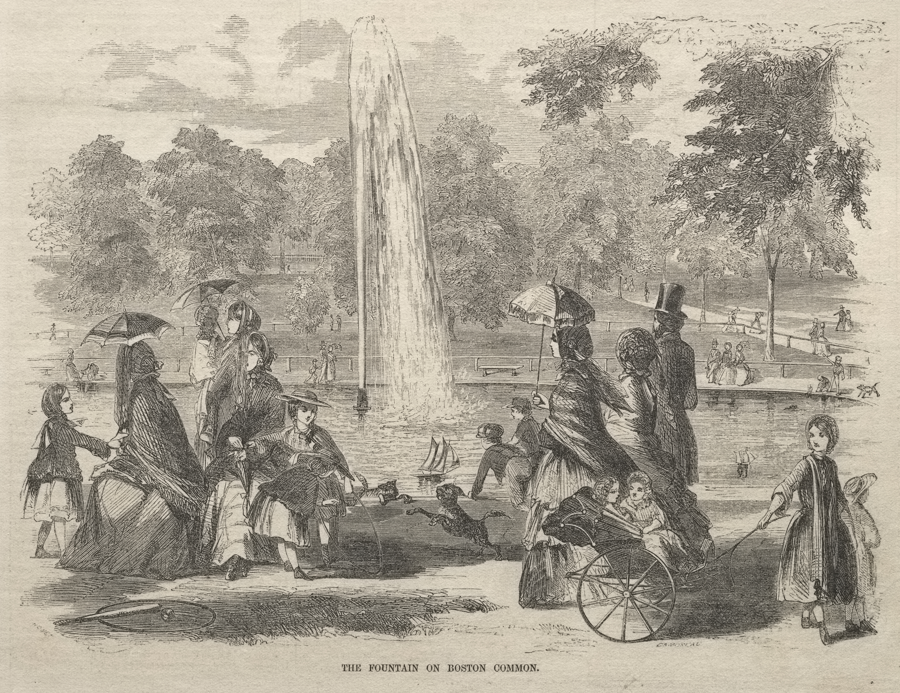The image depicts a black and white drawing of a park scene. A tall, thin fountain shoots water straight up in the center. People in old-fashioned clothing are gathered around the fountain and a small pond. Some hold umbrellas. A woman pushes a baby carriage. Children are at the pond's edge with toy boats. A walking path and trees are in the background. The sky has clouds. The text at the bottom reads "The Fountain on Boston Common".