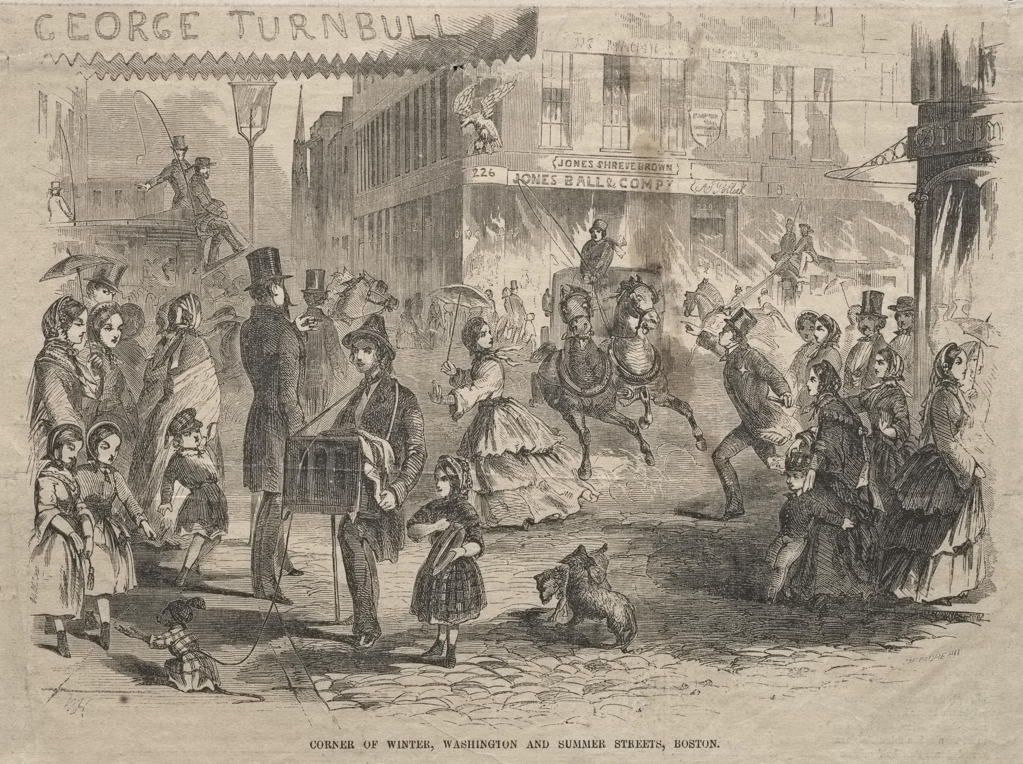 The image depicts a scene of a street corner in Boston. Several people are on a cobblestone street. A dog is in the center. A man on horseback is in the middle, and people are on the sidewalk. A man holds a dog on a leash. Buildings line the street, with a sign on one reading "George Turnbull." Another sign reads "Jones Shreve Brown Jones Ball & Compy." People wear 19th-century clothing, with men in top hats and women in long dresses. A lamppost stands on the right. The scene is in black and white.