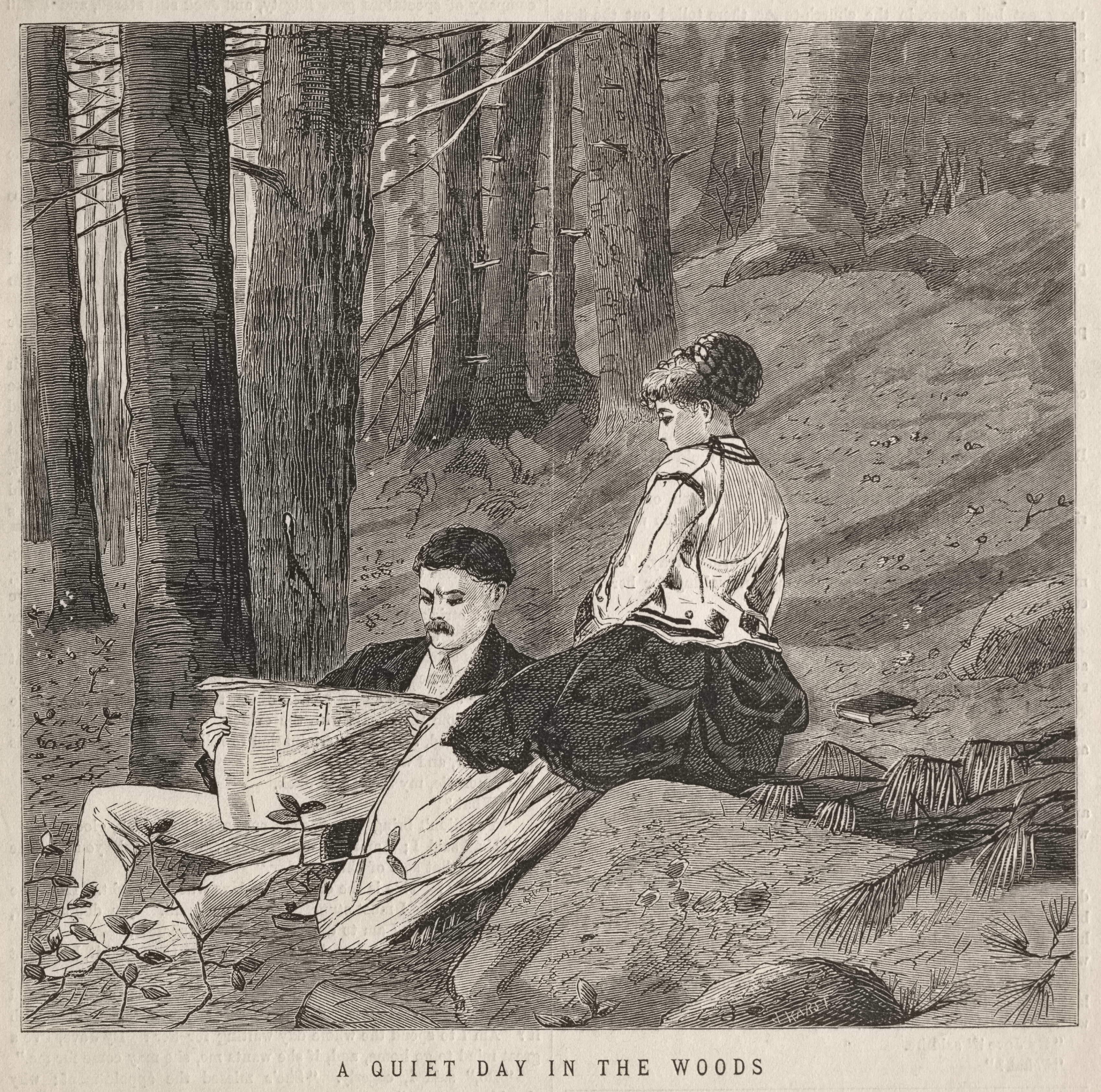 Black and white drawing of a man and a woman sitting on a rock in a wooded area. The man is on the left and wears a hat, jacket, white shirt, and white pants. He sits with his legs outstretched and reads a newspaper. The woman sits on the right with her back to the viewer, wearing a hat, white shirt, and dark skirt. She faces the man. The background shows a wooded area with trees and a hillside. The image is titled "A Quiet Day in the Woods" and is by Winslow Homer.