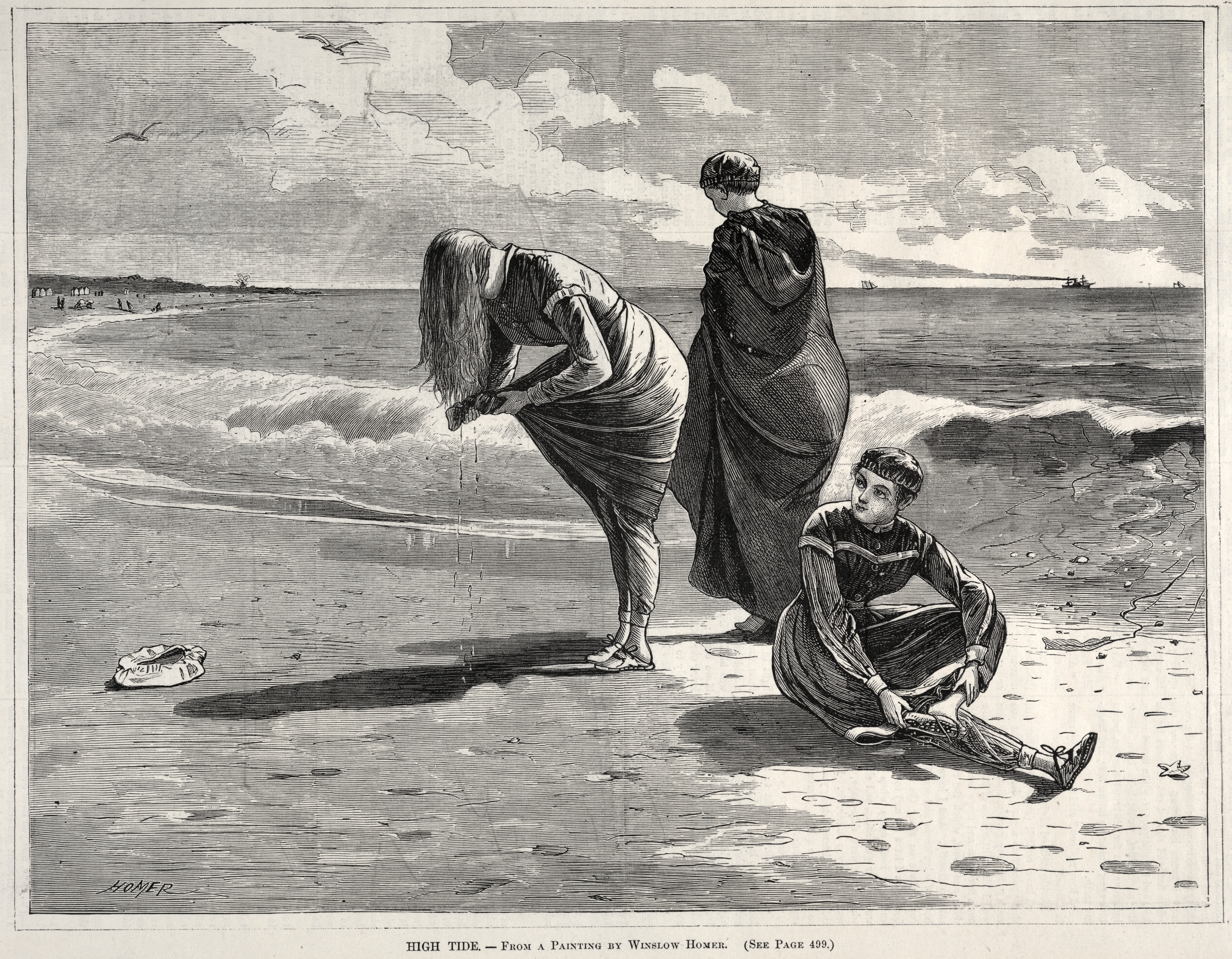 Black and white image of a beach scene. Three women are on the beach. The woman on the right sits on the sand with legs bent. The woman in the middle stands looking out at the water. The woman on the left bends forward at the waist. The woman on the left and the standing woman wear long dresses that cover their feet. The woman on the right wears a long sleeved dress that covers her feet. Ocean waves crash on the shore behind them. The sky has clouds and seagulls fly in the air. A boat is on the water in the distance. A shoreline with buildings is on the left.