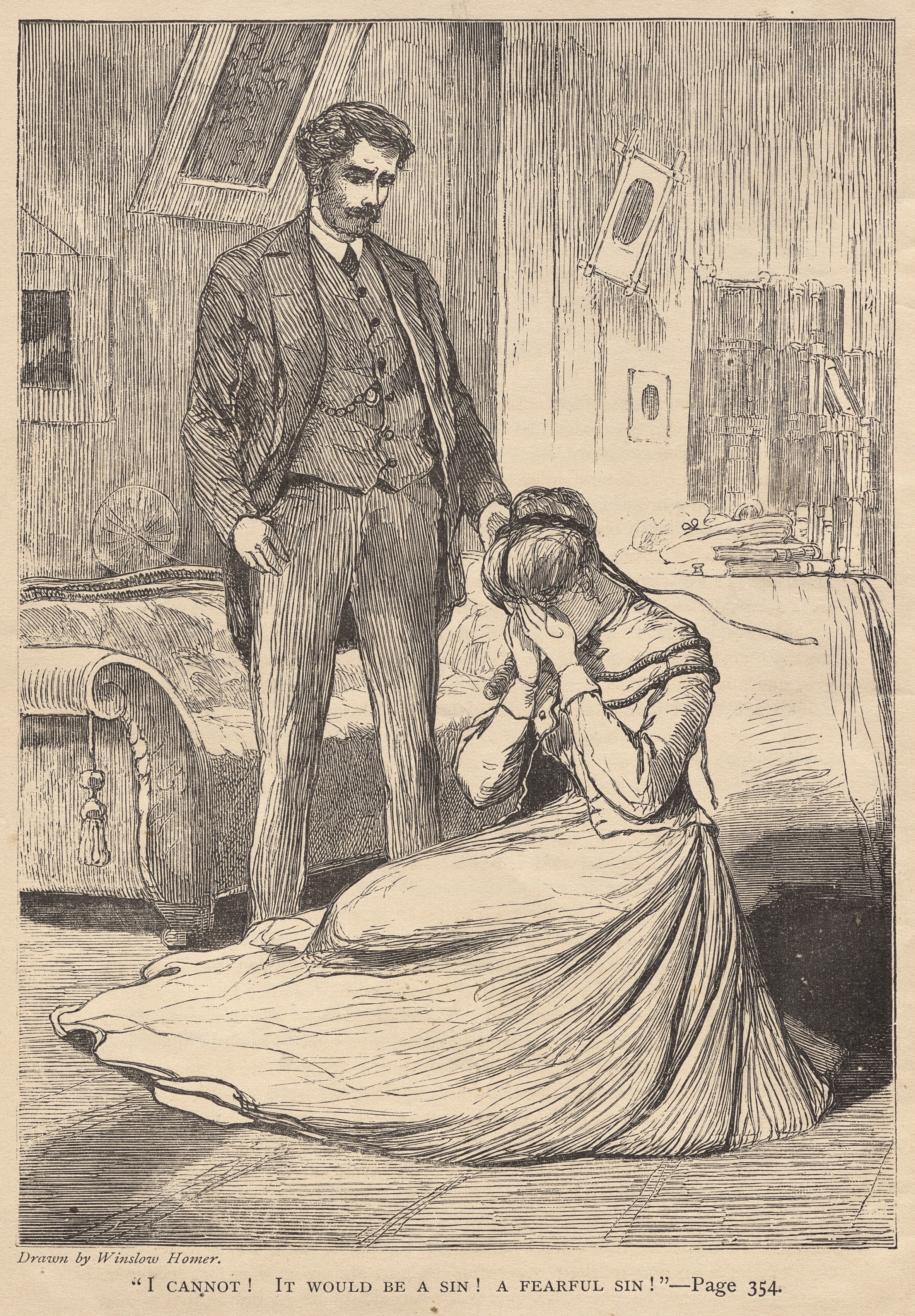 Black and white drawing of a man and woman in an interior. The standing man wears a pinstripe suit with a vest, white collared shirt, and dark tie. The woman wears a long skirt and a head covering; she sits on the floor with her face in her hands. The background includes furniture and two windows; one window is tipped on its side. Caption at the bottom of the drawing reads: "I Cannot! It Would Be A Sin! A Fearful Sin!" Page number 354.