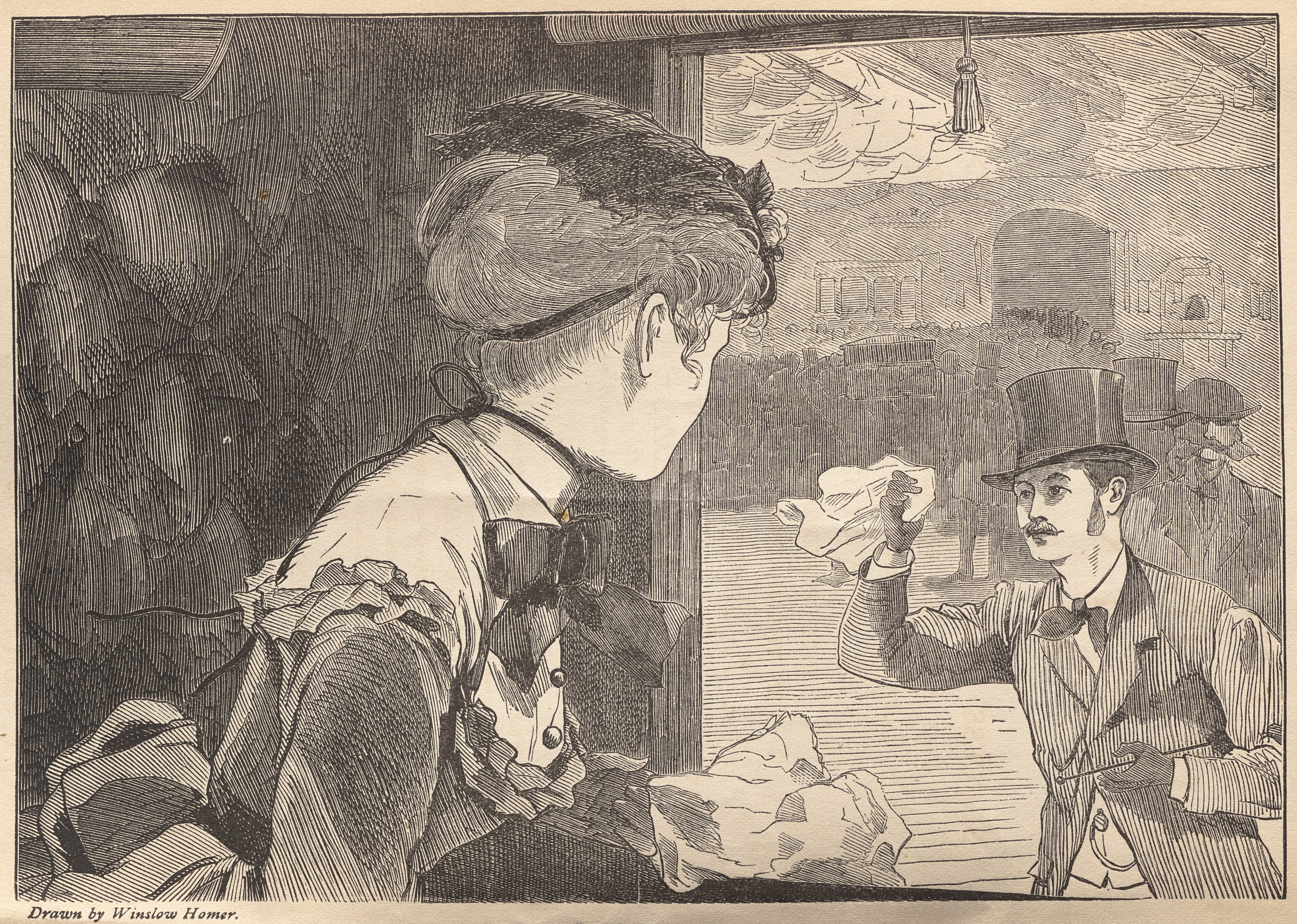 Black and white drawing of a woman with her back to the viewer and short hair. She faces a man wearing a tall hat. The man waves a white handkerchief. A window is in the background. The man and woman are indoors and the background outside the window is blurry. The artwork is titled "Come!" by Winslow Homer. The woman has large puffy sleeves on her dress. The man has a bow tie on. The man sits on the right and the woman on the left. The woman's dress appears to be Victorian. The man in the tall hat waves with his right hand. He appears to be standing.