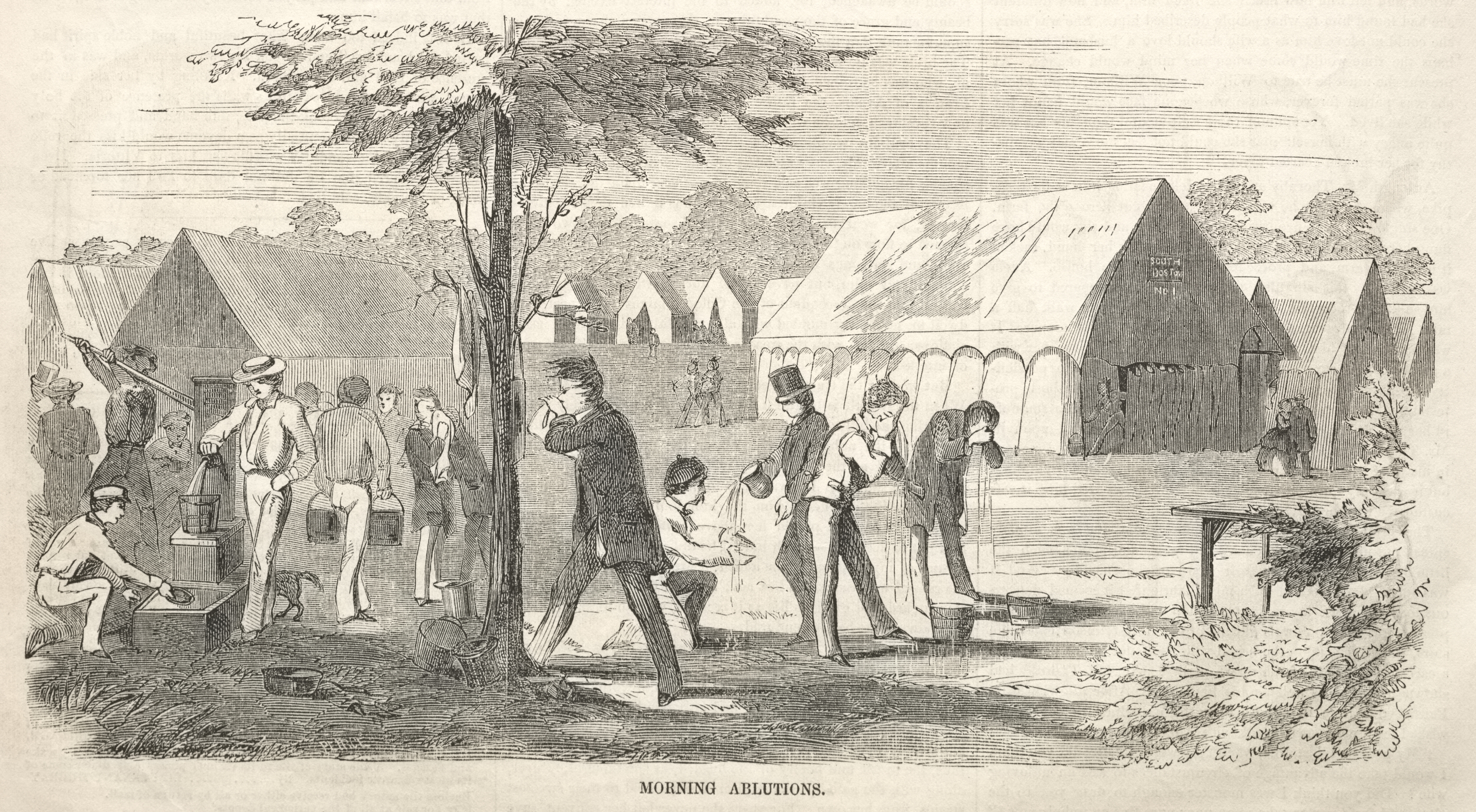 Black and white drawing of a group of people washing themselves outdoors. The group consists of men wearing old-fashioned clothes. A man on the left side of the image squats next to a box. Several people stand on the left side under a tree. Others stand on the right without shirts on. There are several tents and buildings in the background. A tree is on the left side. The drawing has a title at the bottom that reads "Morning Ablutions".
