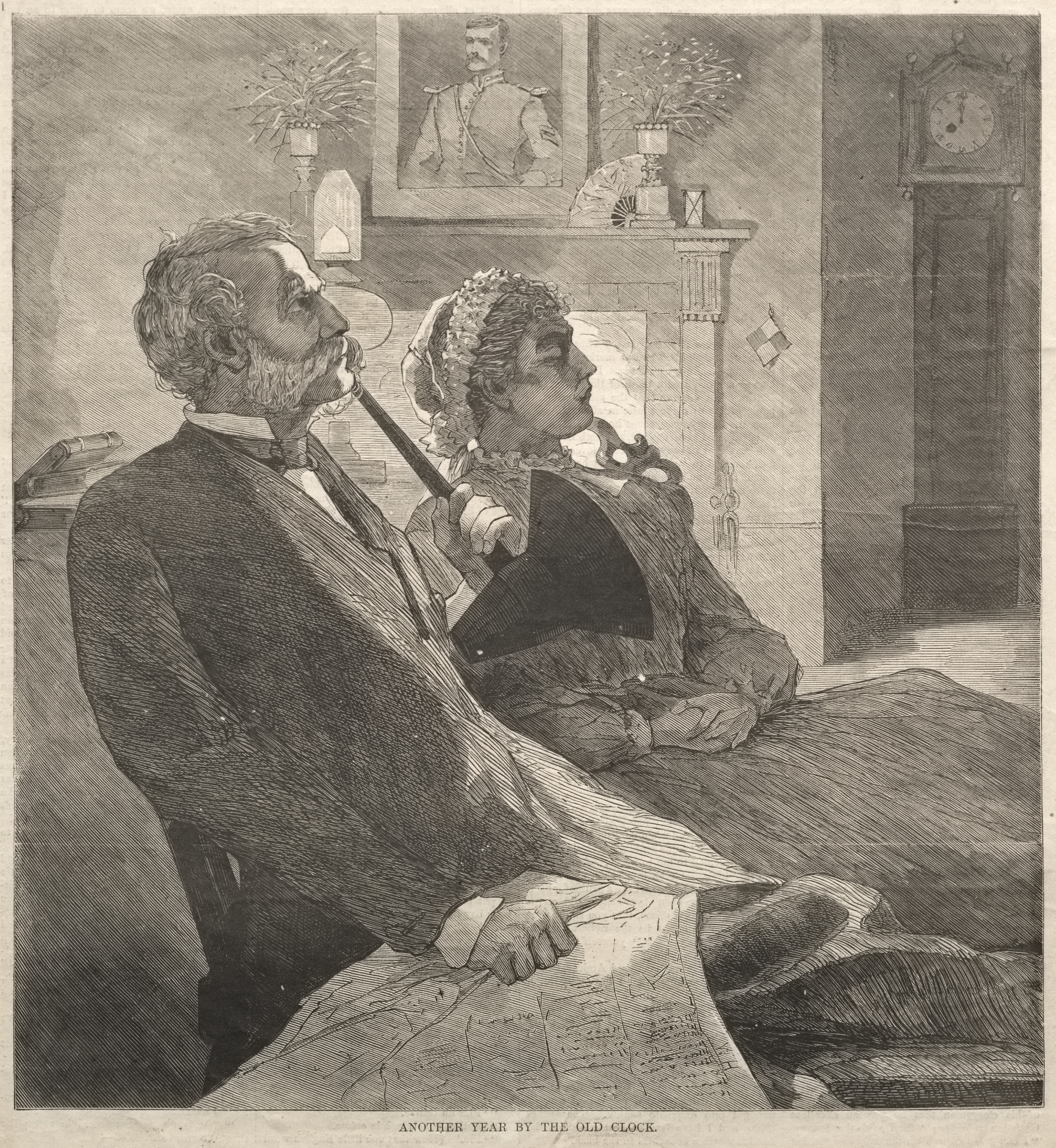 Black and white illustration of an older man and woman seated. The man on left has short hair and a beard; he wears a dark suit, white shirt and bowtie; he holds a pipe in his mouth and a newspaper in his lap. The woman on right wears a dress and a bonnet; her hands are folded. The background shows a mantle with a framed portrait on it, a grandfather clock on right. The caption at the bottom reads "ANOTHER YEAR BY THE OLD CLOCK".
