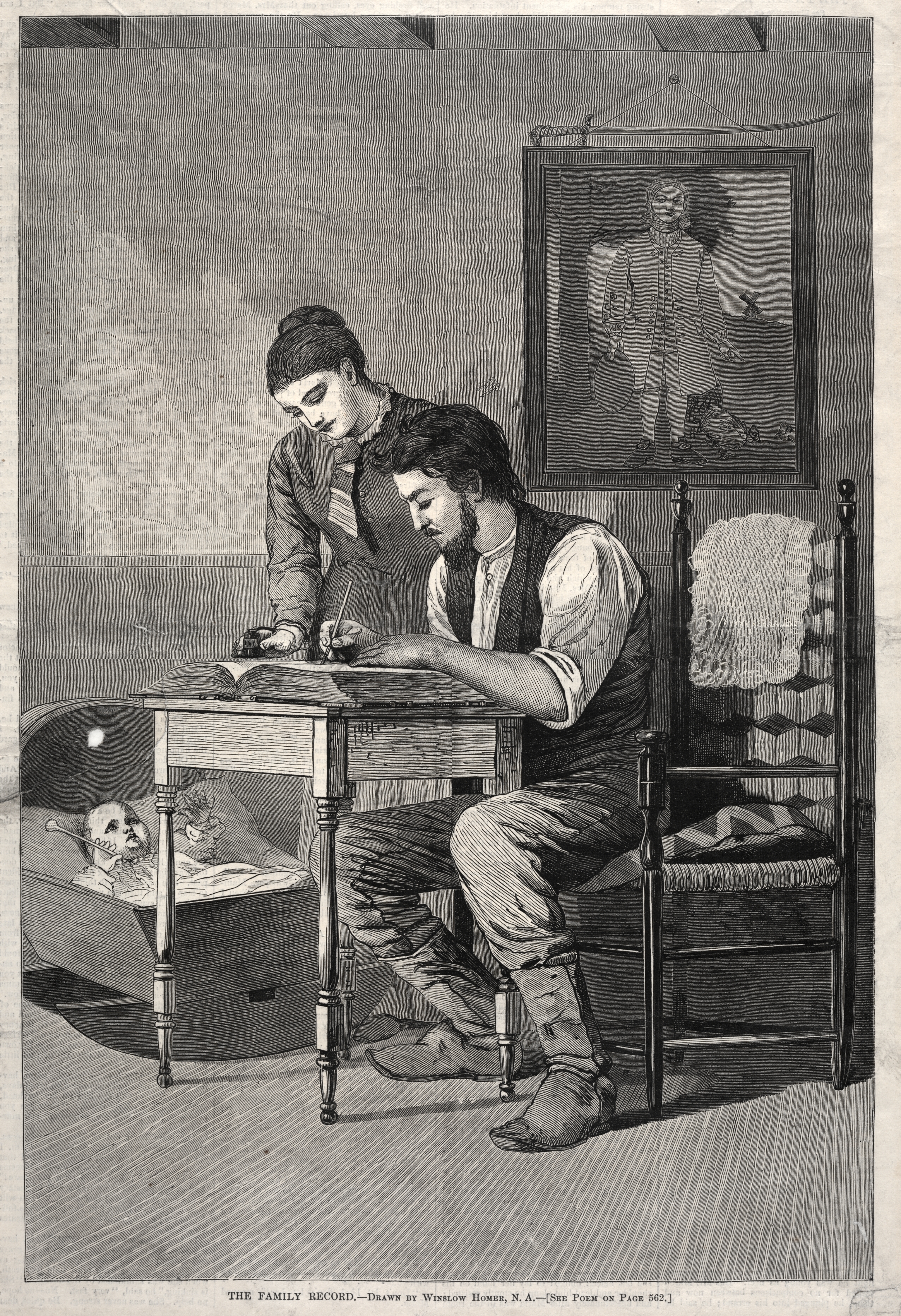 Black and white drawing of a man and a woman. The man is sitting on a chair, leaning over a table with his left arm resting on it. He has dark hair, a beard and mustache and is wearing a white shirt with a vest and loose-fitting pants tucked into boots. The woman has her dark hair pulled up and is wearing a long-sleeved shirt. She is standing behind the man. On the table is an open book and an inkwell with a quill. To the left of the table is a wooden chest with a human skull on top. The wall behind them has a framed picture of a young boy in a military-style outfit and a sword hanging above it. The floor is wood.