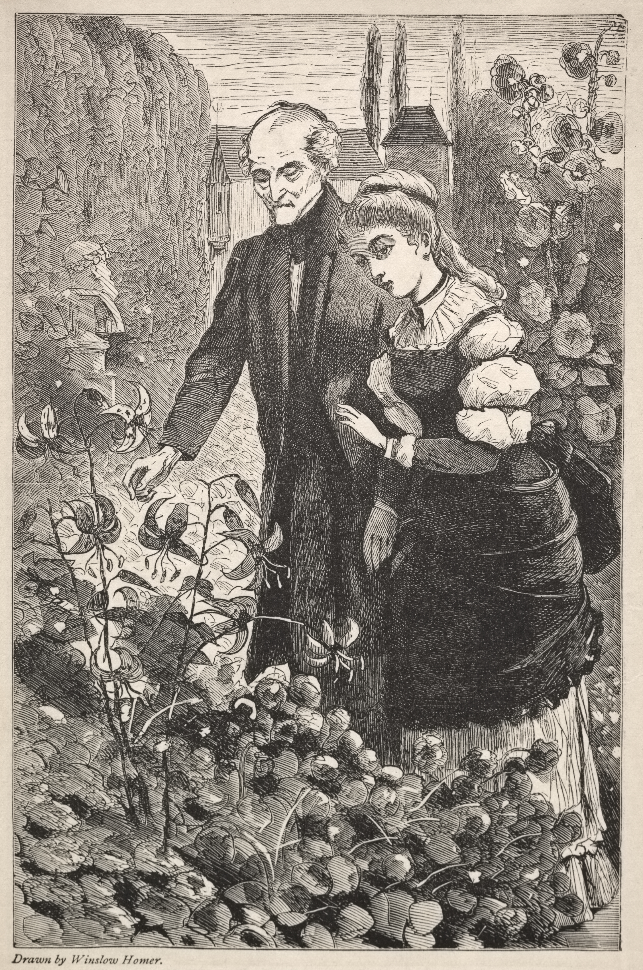 Black-and-white drawing of a man and woman standing together in a garden, surrounded by flowers and plants. The man on the left has a balding head with thinning hair combed back, wearing a dark suit jacket and vest over a white shirt with a bowtie, and dark pants. The woman on the right has long hair pulled back and wears a dark dress with puffy sleeves and a white collar. The garden has a variety of plants and flowers, and a building with a tower and roof is visible in the background. The artist's name is written in small text at the bottom left. The title of the piece is at the top.