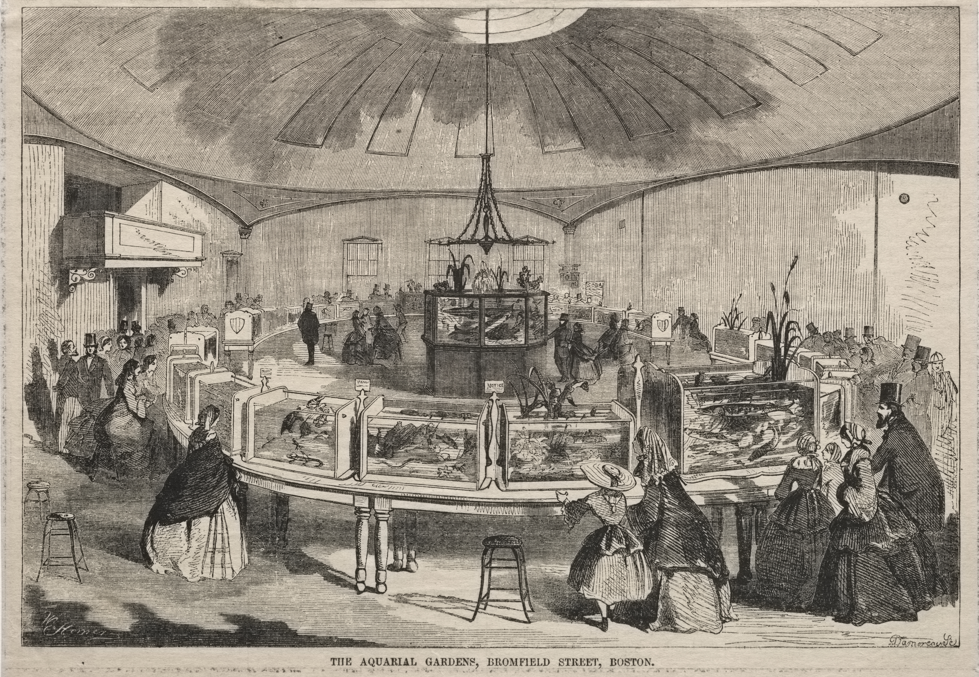 Black and white drawing of an aquarium interior. Large domed ceiling with a round skylight at its center. Central circular display case filled with fish and other aquatic creatures. Multiple rectangular display cases around perimeter. People dressed in old-fashioned clothing looking at displays. Round chandelier hanging from ceiling. Sign labels the location as "The Aquarial Gardens, Bromfield Street, Boston". Artist's signature appears in bottom corners. Tan border surrounds drawing. Image appears to be old.