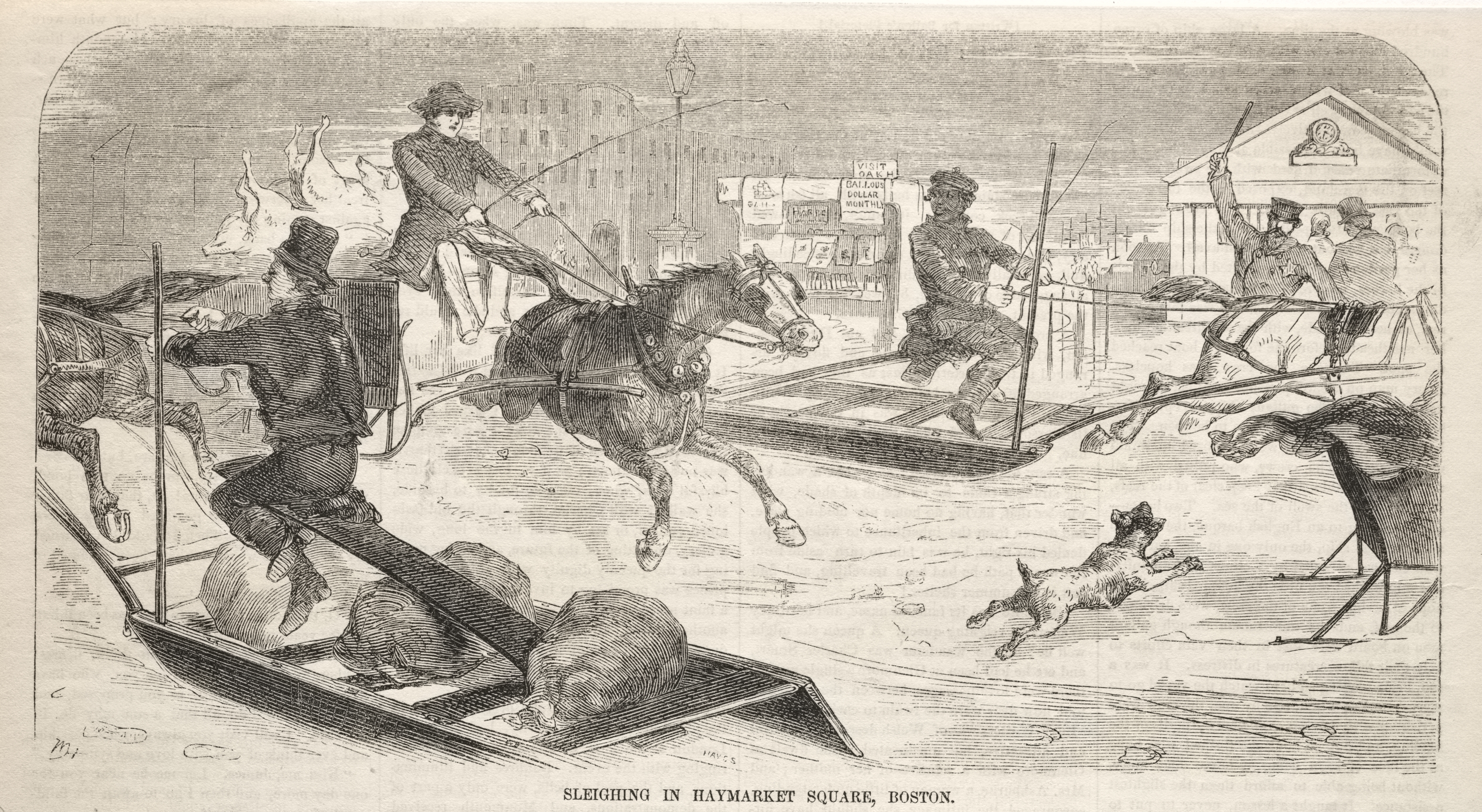 Black and white drawing of people sleighing. Two horses pulling sleighs with people on them jumping over a third sleigh with a man and a dog on it. The man and dog are on a flat platform-like sleigh. Two other sleighs are pulled by horses. A man holds on to one horse while the other man holds on to the other horse. A dog runs alongside one sleigh. The scene is set in a city square with buildings and people in the background. A dog runs in front of a sleigh. A dog runs beside a sleigh. Buildings line the background. A building with a triangular pediment is on the right side. A lamppost is on the left side.