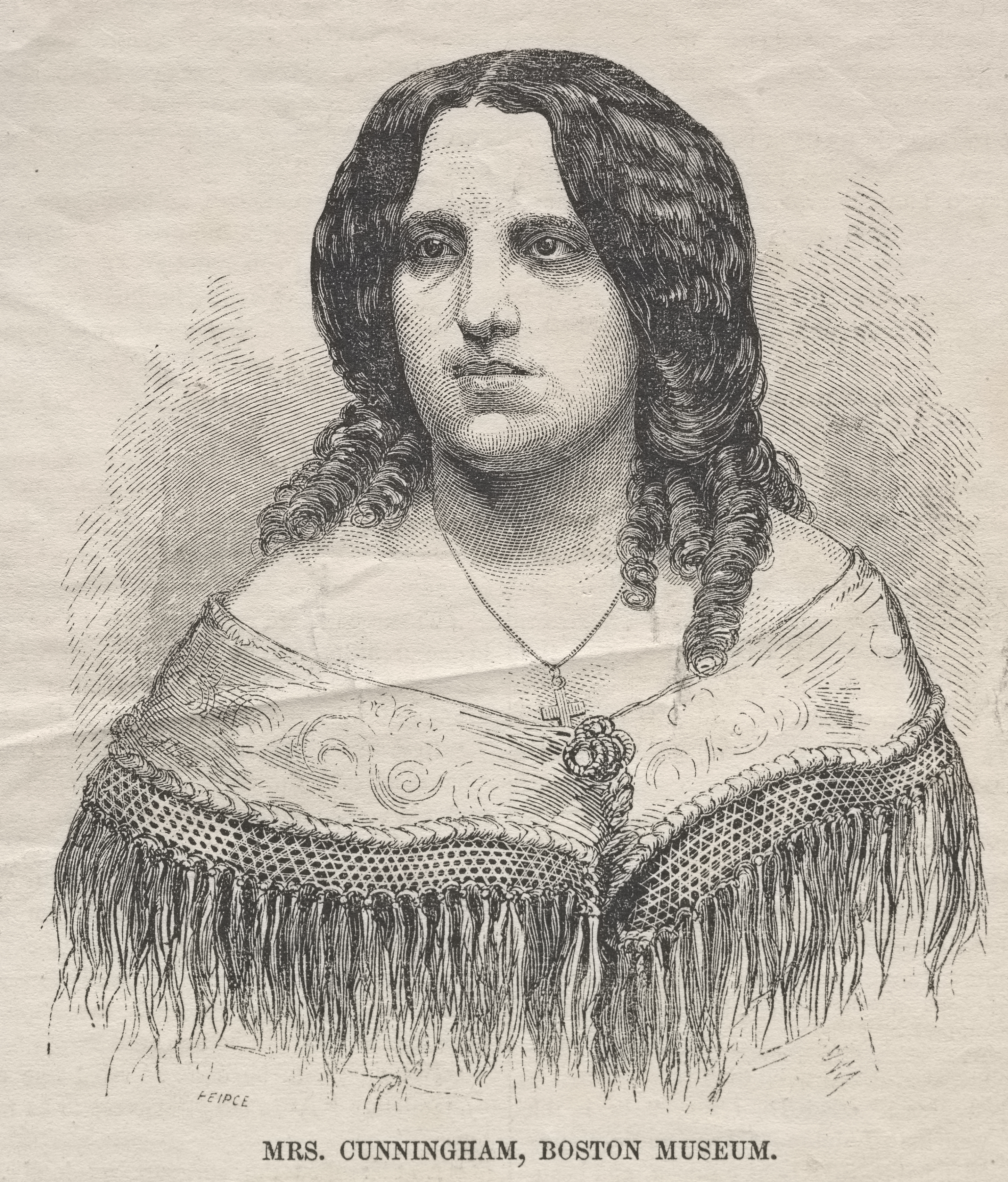 Black and white drawing of a woman with long, curly dark hair, wearing a shawl with fringe and a pendant necklace. The woman is drawn from the chest up and is looking straight ahead with a neutral expression. Her hair is parted down the middle and falls in loose curls on either side of her face. She wears a shawl with a decorative top edge and long fringe hanging down. A necklace with a pendant in the shape of a cross hangs around her neck. The background is a light-colored texture with lines radiating out behind the woman's head. Text at the bottom reads "MRS. CUNNINGHAM, BOSTON MUSEUM".