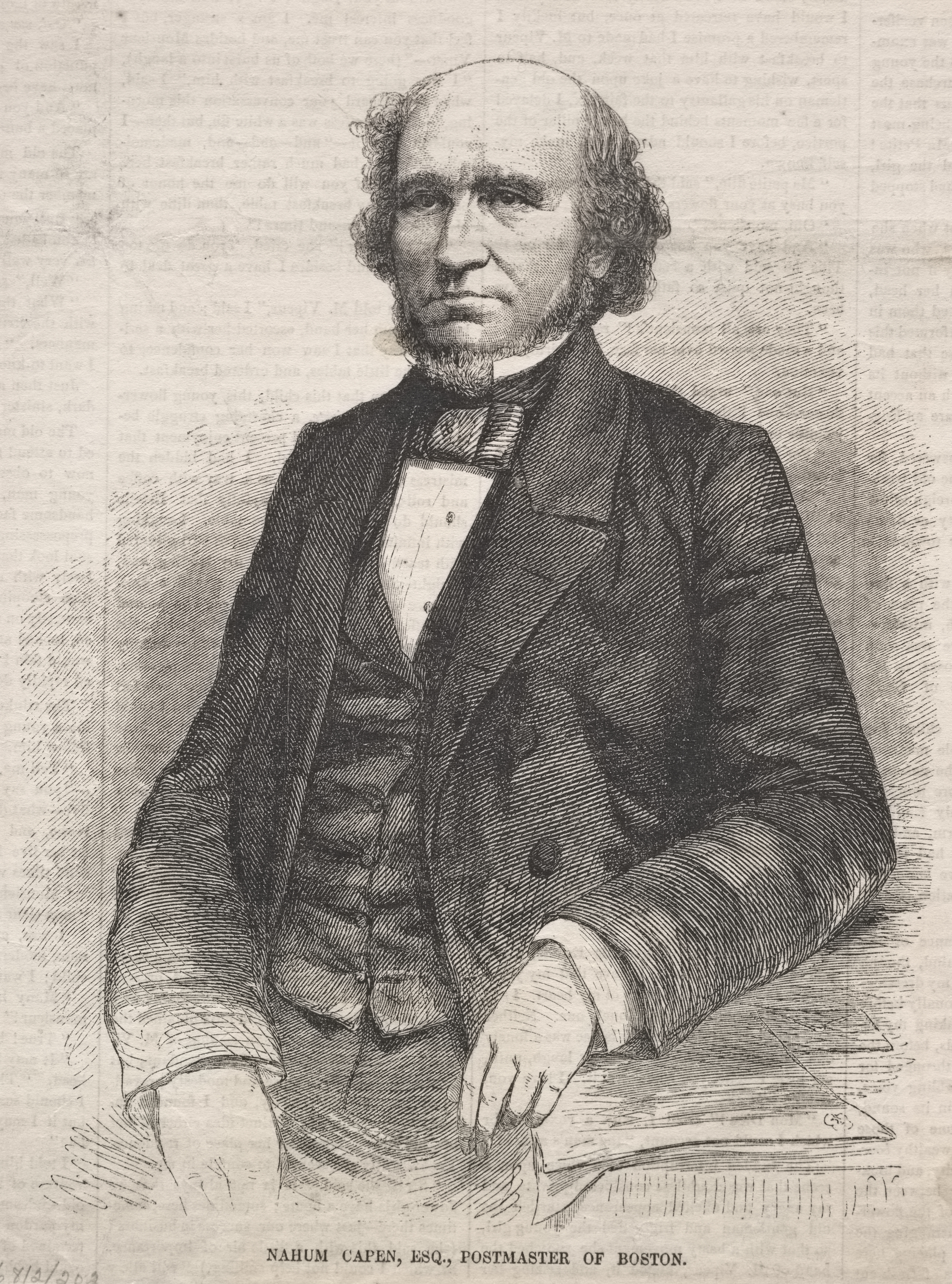 Black and white illustration of a man with a receding hairline and thinning hair on the sides. He wears a dark suit jacket, vest, and bow tie. The man has a beard and mustache. His right arm rests on a surface with his hand visible, and his left arm is mostly out of view. The background resembles a wall or other surface with shading behind the man. The image includes the text "NAHUM CAPEN, ESQ., POSTMASTER OF BOSTON" at the bottom.