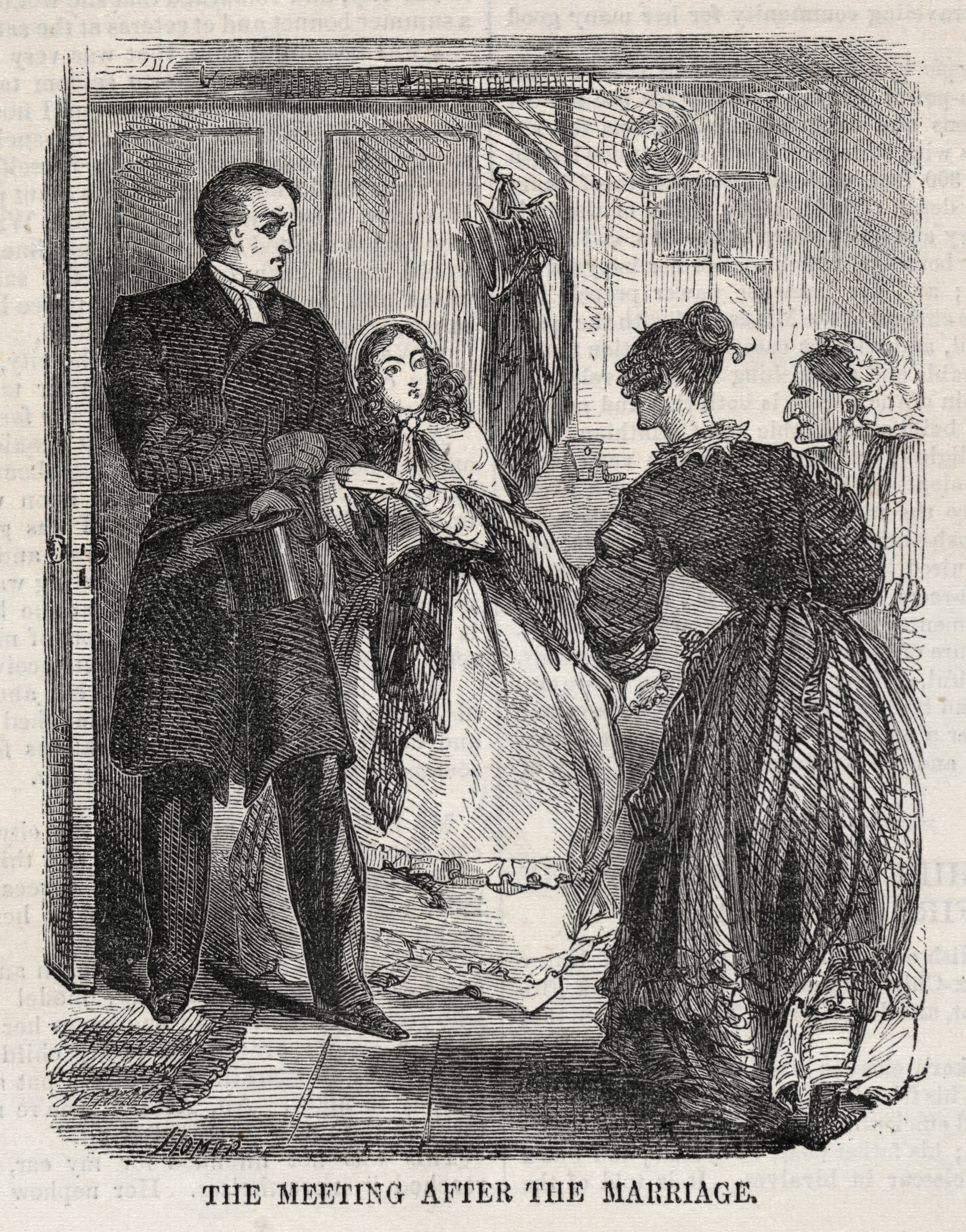 Black and white drawing of four people indoors. The man on the left has dark hair combed to the side and wears a dark suit with a white shirt and a tie. The woman to his right, in the center, has curly hair and wears a long white dress with a shawl over her shoulders; she faces a woman on the right who wears a long dark dress. The woman on the right faces away from the viewer, with her dark hair in a bun. A woman stands behind the central female figure; only her lower body and one arm are visible. The background shows an interior room with a tiled floor and a rectangular window on the right. Text at the bottom of the image reads "THE MEETING AFTER THE MARRIAGE."
