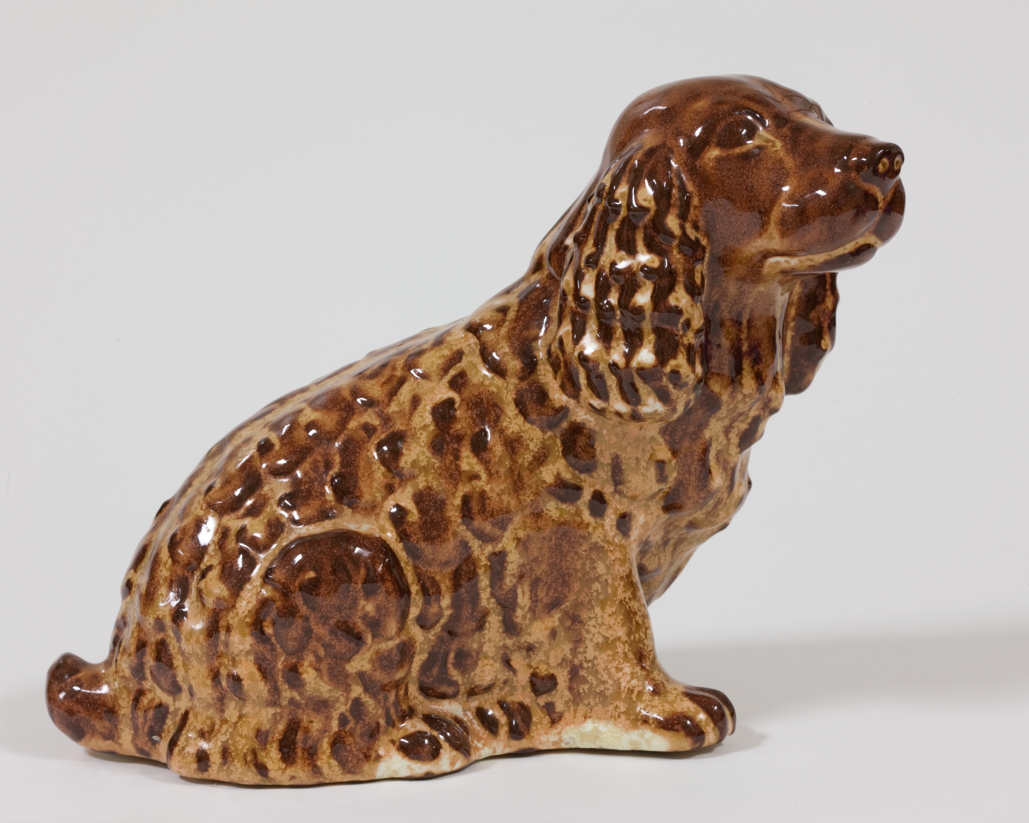Brown and tan ceramic dog figurine with a glossy glaze, depicting a spaniel sitting with its head turned to the right. The dog has a brown face, ears, and tail, with a tan and brown mottled body. The figurine sits on a plain white surface with a white background. The spaniel, by Chester Nicodemus.