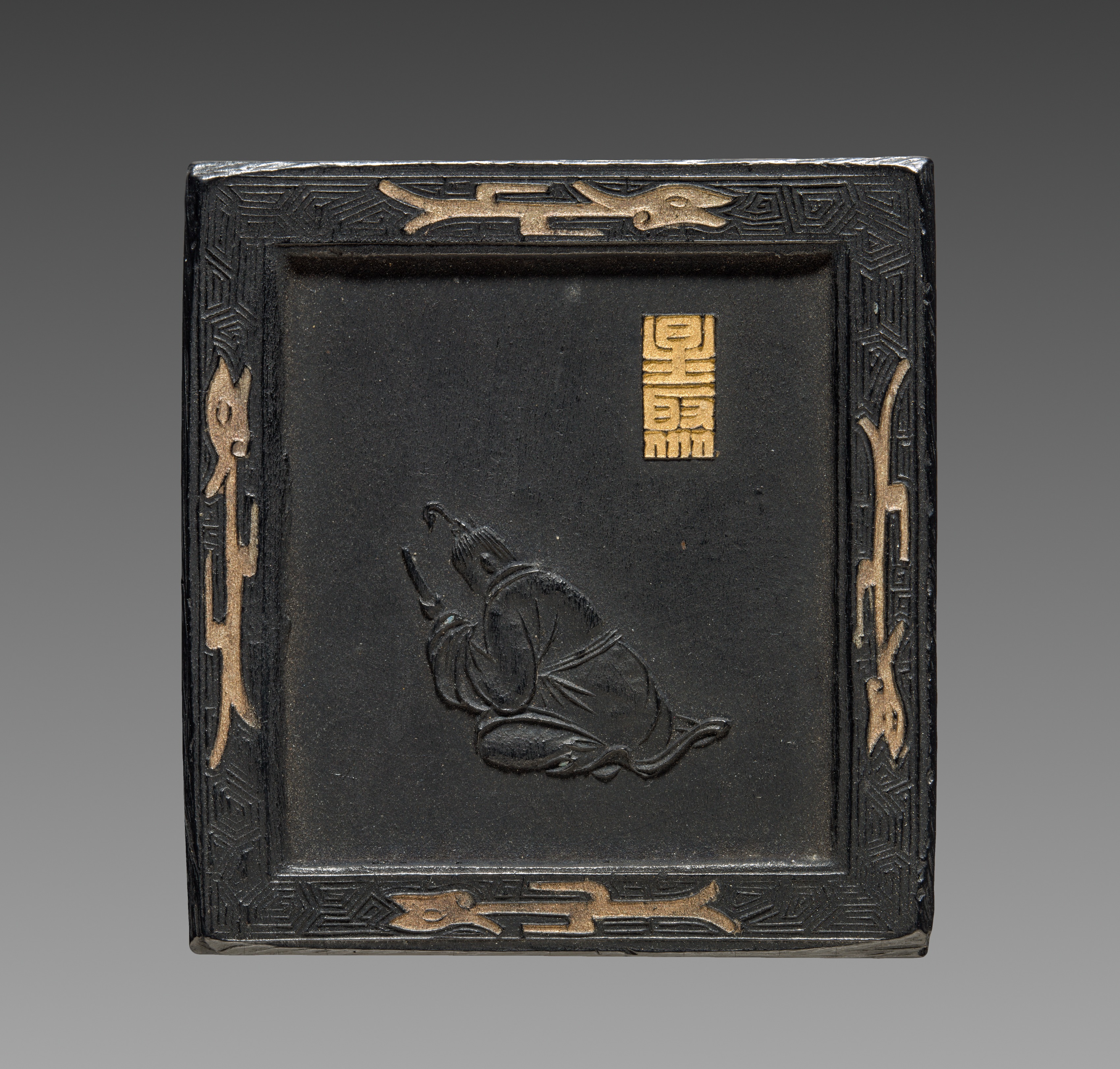 The image depicts a square, black ink cake with a raised design. The ink cake is framed by a border with a geometric pattern and gold accents. In the center of the ink cake is a raised image of a person sitting cross-legged, with their hands raised to their face. Above the person, there is a vertical line of gold Chinese characters. The background of the image is a gradient from dark gray at the top to light gray at the bottom. The image is titled "Ink Cake" and the artist is unknown.