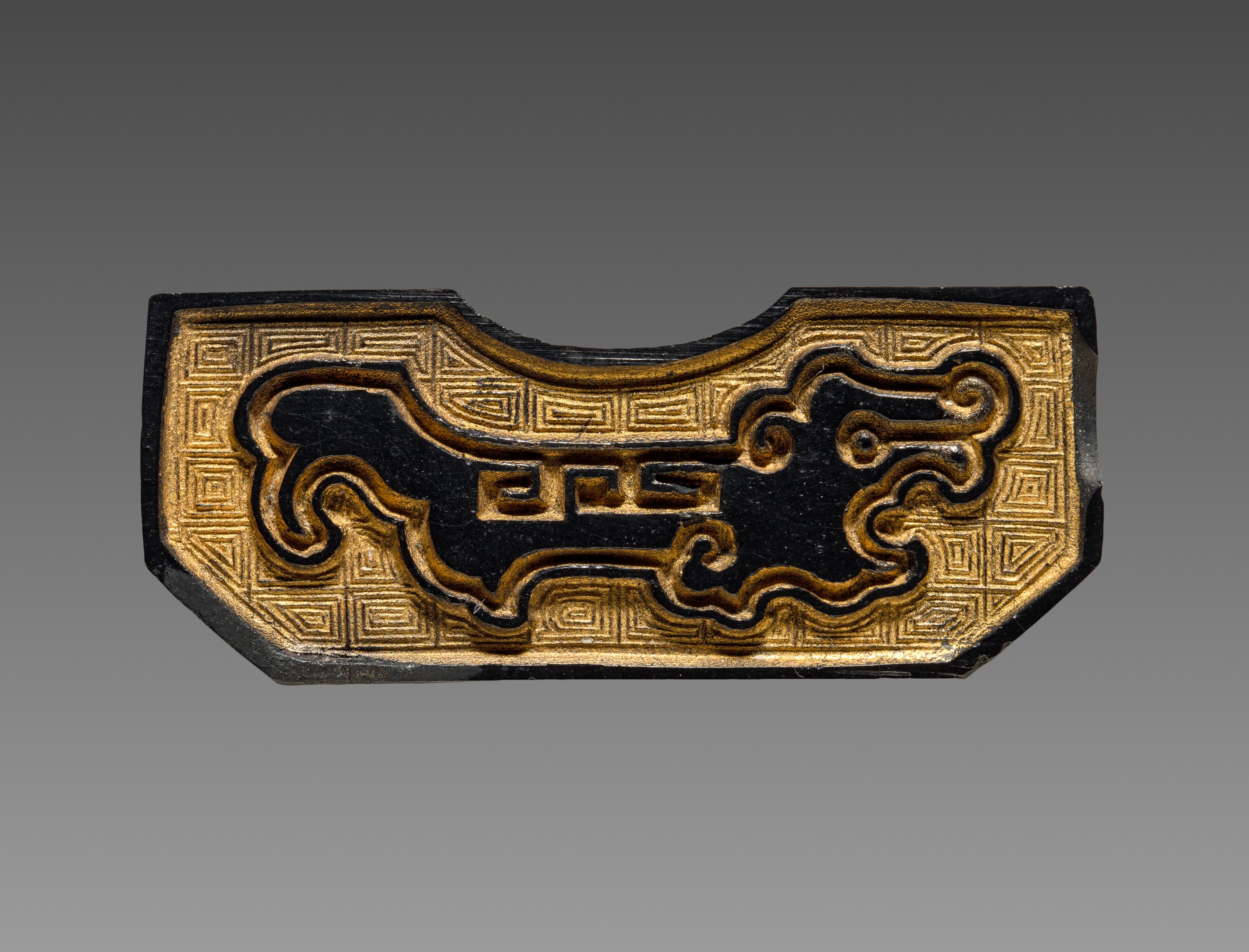 Rectangular object with curved top and flat bottom, featuring a golden design on a black background. The object is primarily black with gold accents. A stylized animal design, resembling a dog or mythical creature, is centered on the object. The creature has a long body and curled tail. The object has a geometric patterned border. The background of the image is a gradient transitioning from dark gray at the top to light gray at the bottom. Title: Ink Cake, Artist not specified.