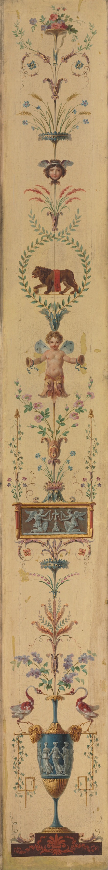 The image depicts a long, vertical decorative panel. The panel background is a faded cream color. There are eight distinct sections on the panel. The top section features a mushroom-like plant with green leaves and blue flowers. The second section features a lion-like creature. The third section features a cherub with wings. The fourth section features a rectangular frame with indistinguishable images. The bottom section features a blue vase with a gold base and handles shaped like birds. The vase is decorated with a scene and has purple flowers. The panel's design is symmetrical, with sections mirrored on either side of the central axis. The overall design is intricate, with detailed patterns and colors throughout. The artist of the panel is Pierre Rousseau, and the title is "Decorative Panel".