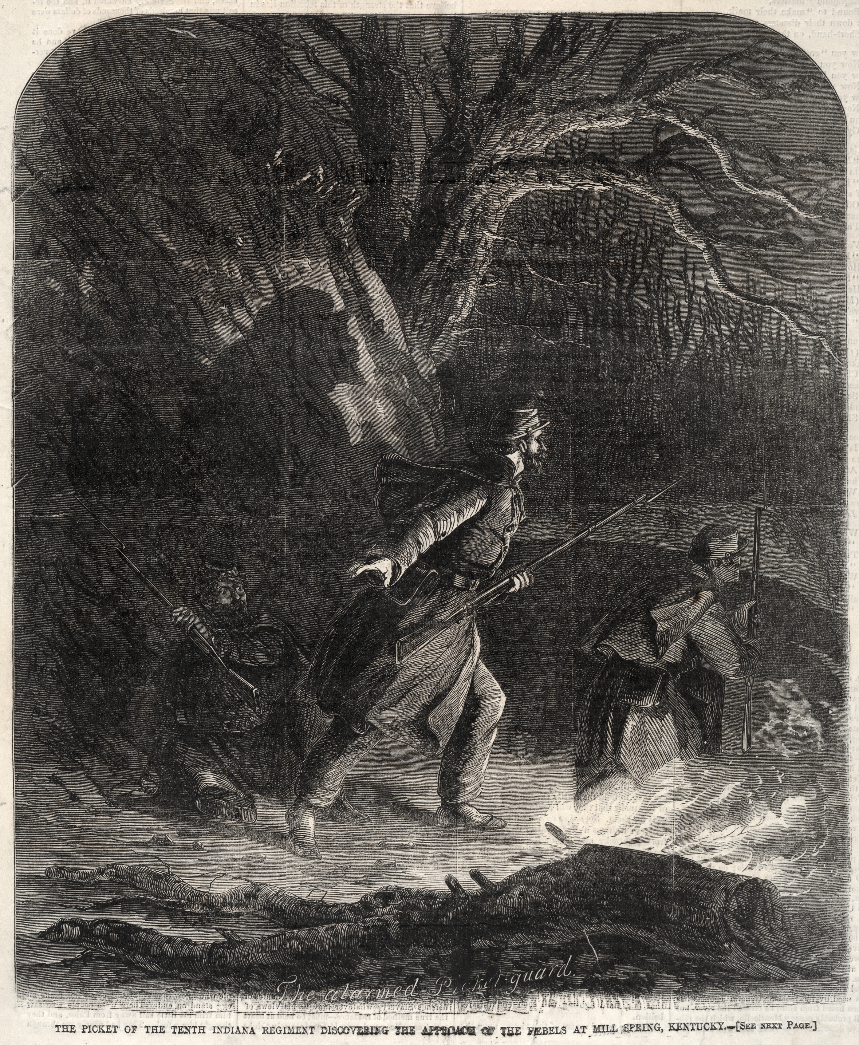 Black and white image. Three men in a wooded area at night. The man on the left is crouched and holds a rifle. The middle man stands and holds a long gun or pole. The man on the right crouches near a light source. A large tree dominates the upper center. A caption reads: "The picket of the Tenth Indiana regiment discovering the approach of the Rebels at Mill Spring, Kentucky."