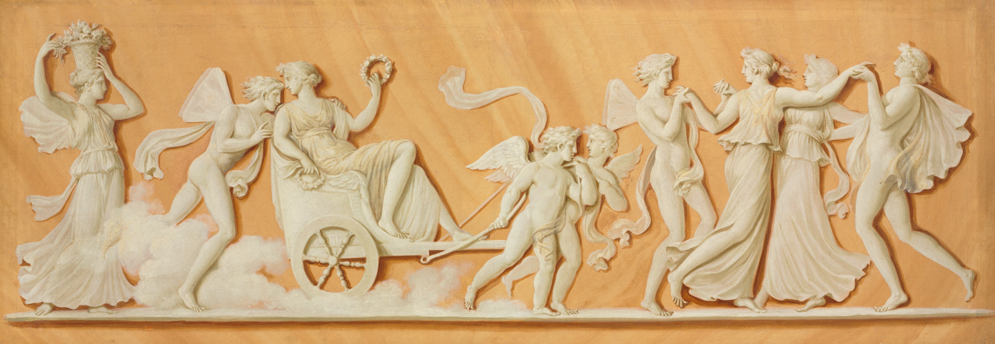 Overdoor Painting by Pierre Rousseau: The relief sculpture depicts a procession of eight figures against an orange background. The scene features a woman in a reclining position with her right leg bent and left leg extended, sitting in a chariot with one wheel. She wears a flowing dress and holds a wreath in her right hand. Two cherubs pull the chariot, one on each side. To her left stands a woman wearing a long dress and a floral crown on her head, with her right hand raised to her head and her left hand on her hip. On her right side, a naked winged man runs. The woman in the chariot and the cherubs and figures to her right are sculpted in white. The woman on the far left and the cherubs and women on the right are sculpted to appear as if they are made of white marble. Their facial features are detailed, with the figures appearing to move in a line. The background has diagonal streaks.