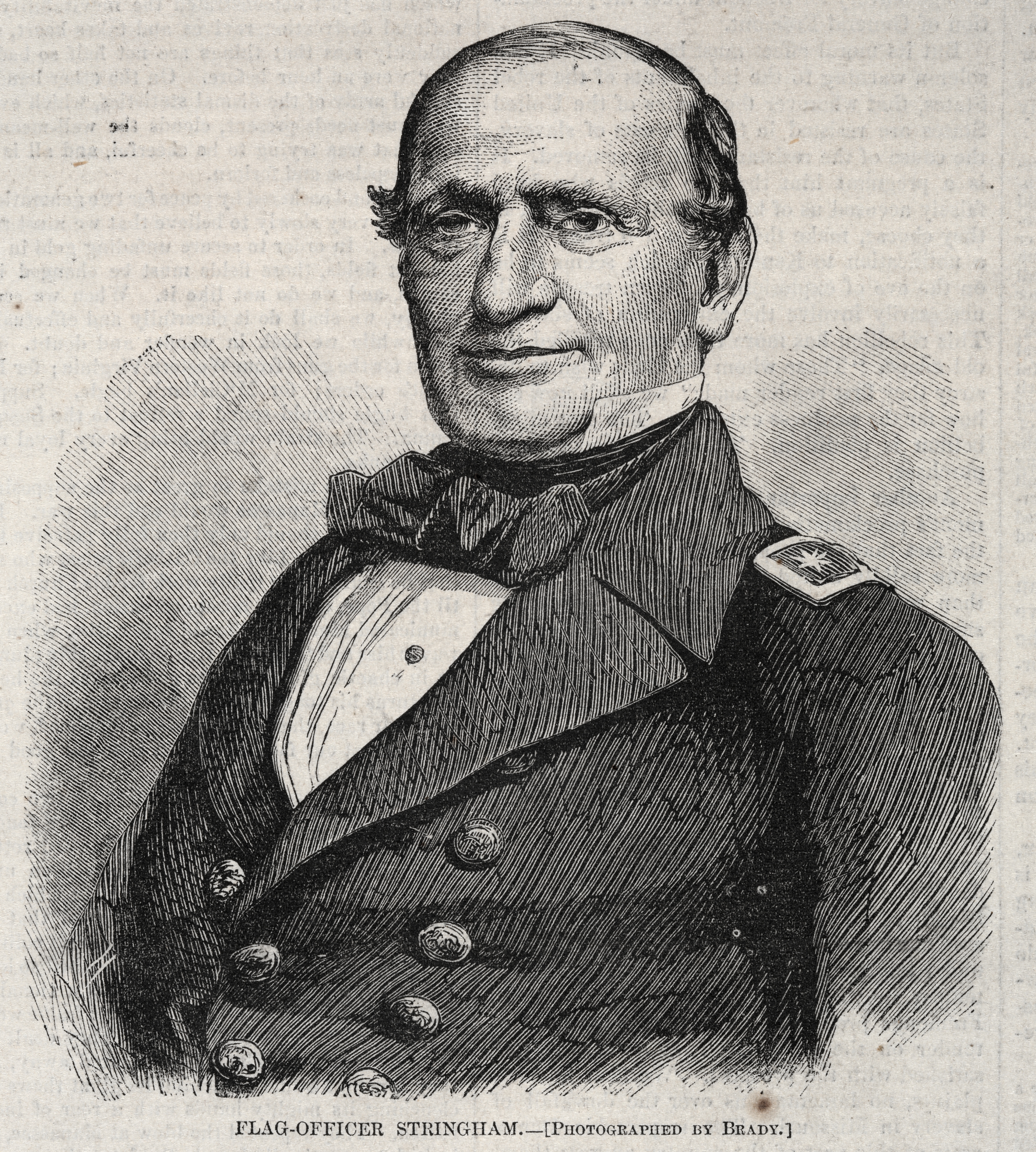 Black and white drawing of a man with a receding hairline wearing a dark military jacket with eight buttons down the middle, dark bowtie, and white shirt; epaulet on left shoulder has insignia; man looking to the right with neutral expression; background resembles newspaper. The image depicts Flag Officer Stringham by Winslow Homer.