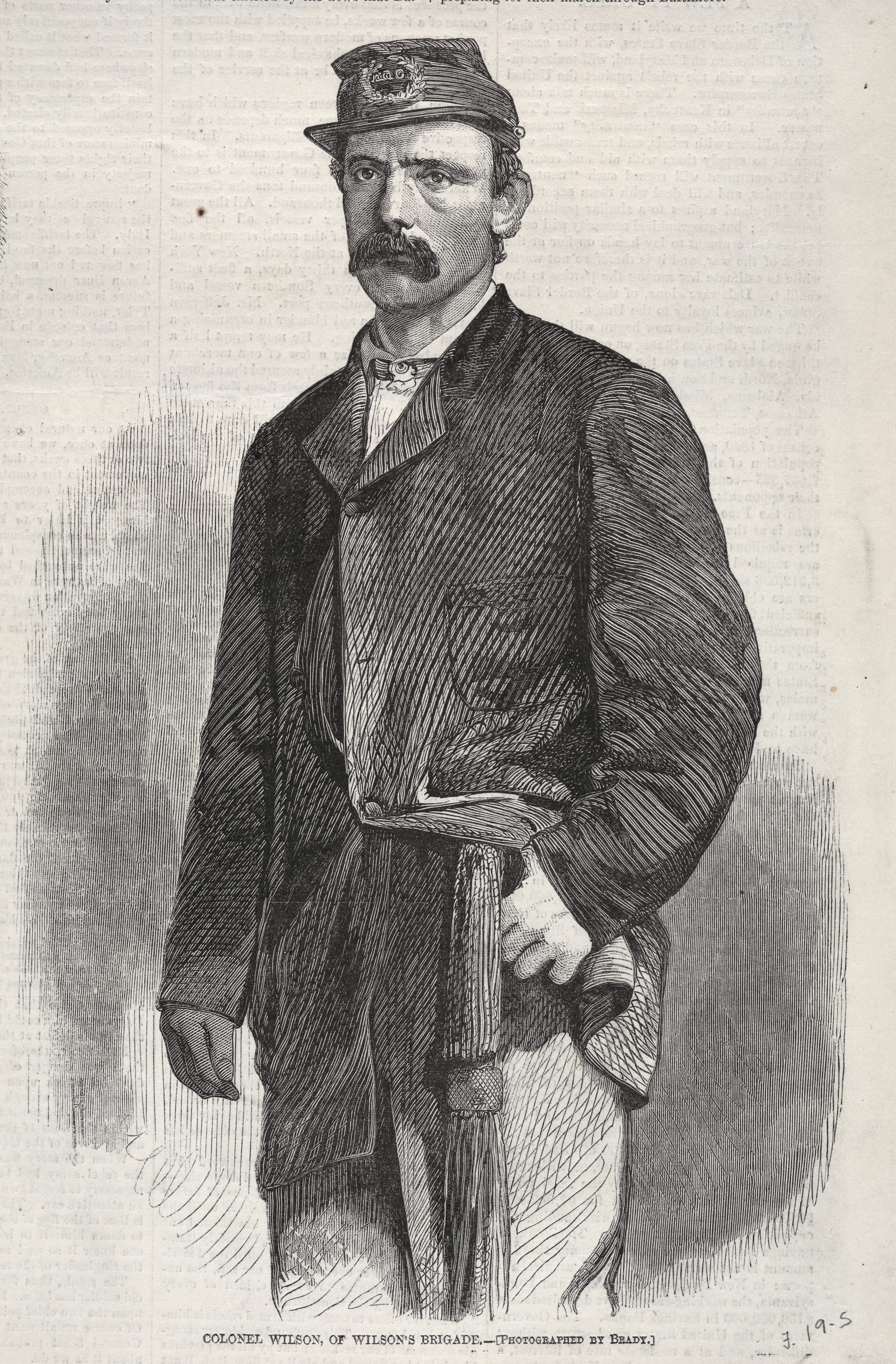 Black and white drawing of a man wearing a hat. He has a mustache. He wears a jacket with a vest underneath. He also wears a collared shirt and a bowtie. He holds a rolled-up umbrella in one hand. The man stands in front of a gray background. A caption below the drawing reads "Colonel Wilson, of Wilson's Brigade" and a smaller text mentions that he was photographed by Brady.