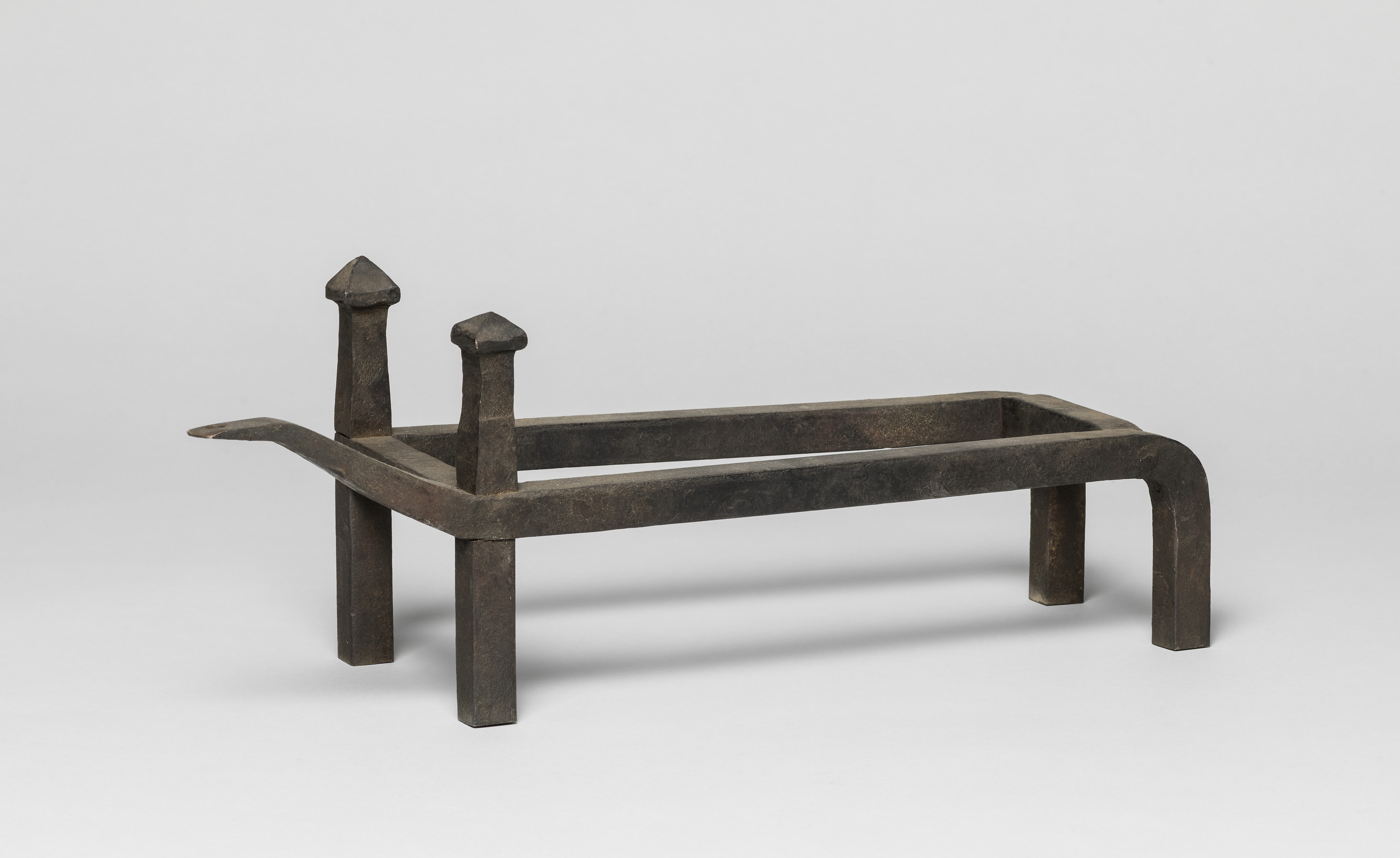 Dark gray andiron with a rectangular base and four legs. The left and right sides are open. A curved piece of metal extends from the left side. Two short, thick, tapered posts rise from the back. The post on the left is taller. The background is light grey. The title is "Andiron".