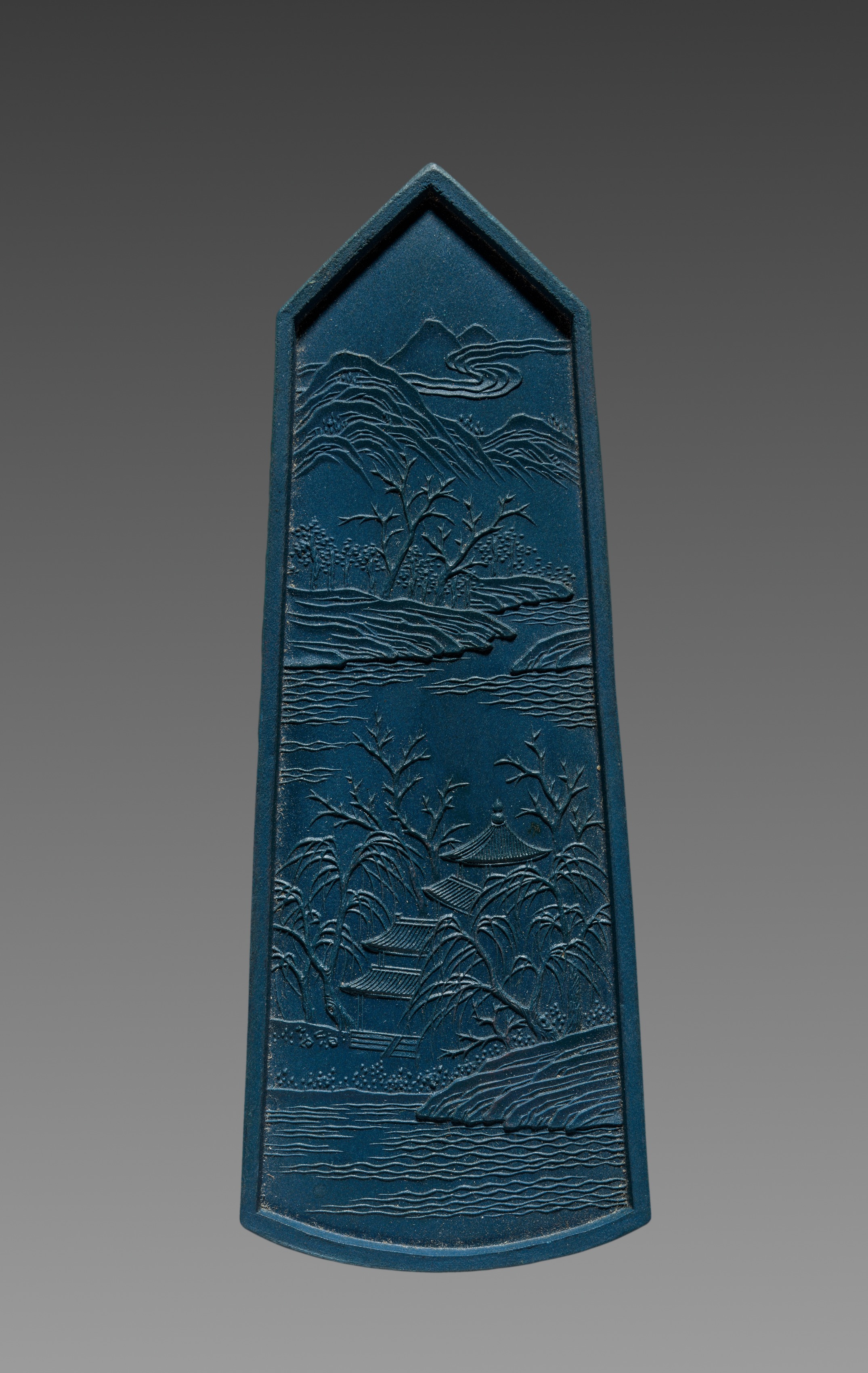 Dark blue, rectangular ink stick with a pointed top and curved bottom. The ink stick features an embossed design depicting a landscape with mountains, water, and trees. The top half shows a mountain range with wavy lines representing hills and a body of water. The bottom half depicts a building near a body of water with trees on either side. The background of the image is a gradient transitioning from dark gray at the top to light gray at the bottom.
