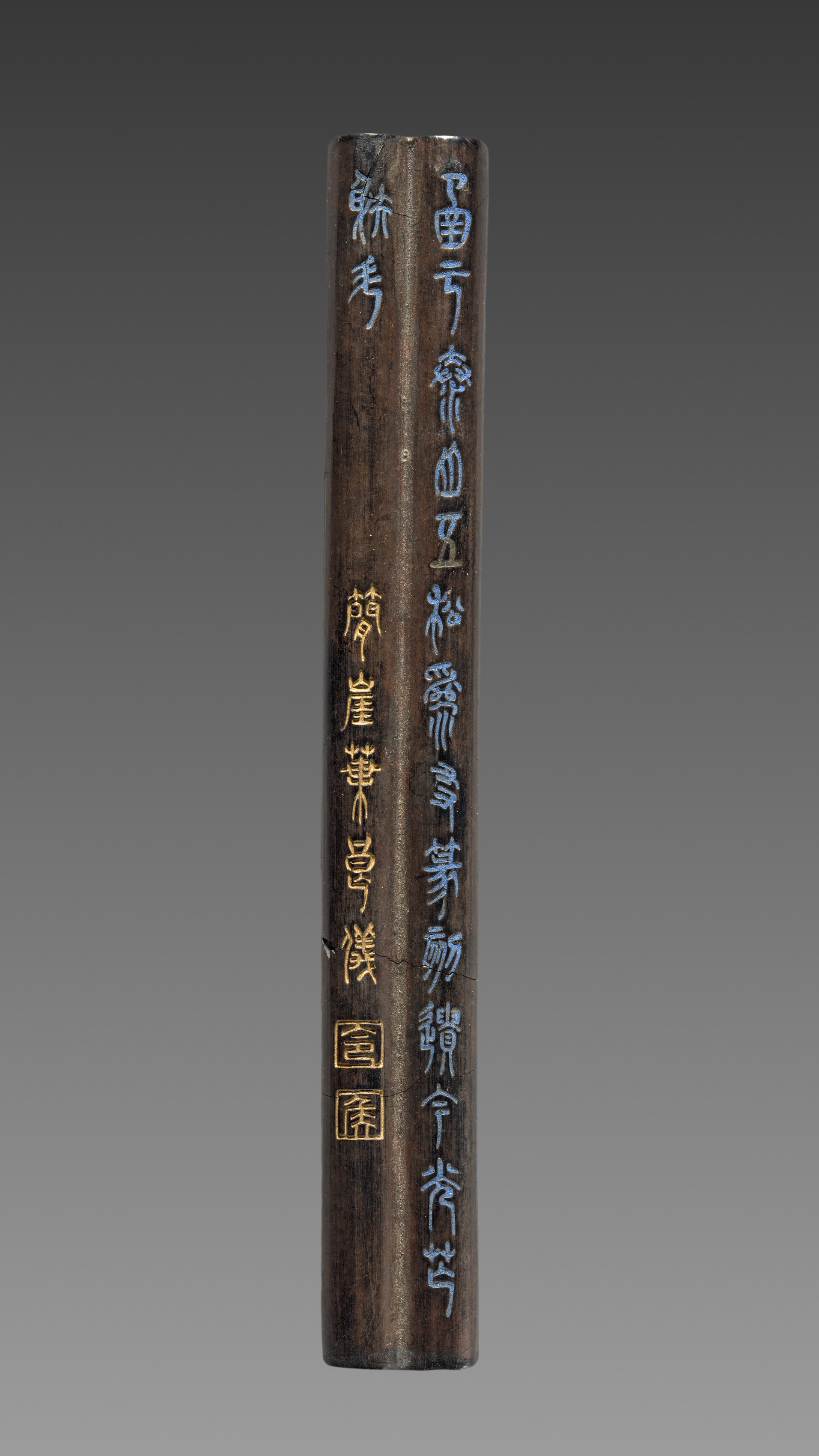 Dark brown, cylindrical object with rounded edges. Vertical, light blue and gold Chinese characters on the surface, arranged in two columns. The left column features gold characters, while the right column features light blue characters. Two small, square gold symbols are present, one near the bottom of the left column and one below it. The background is a gradient of dark grey to light grey. The object is titled "Ink Cake" and is by an unspecified artist.