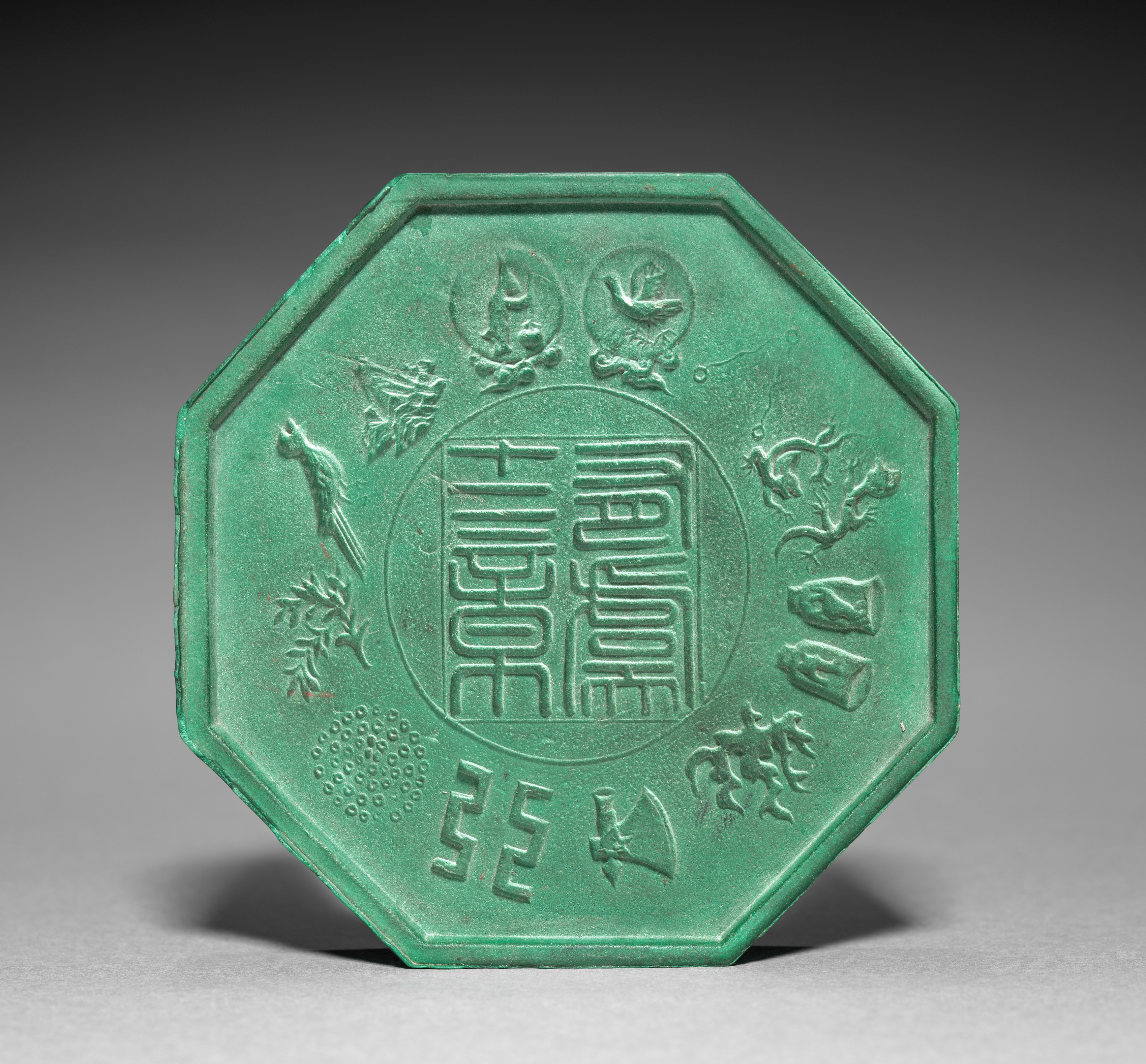 Green octagonal ink cake with embossed designs and Chinese characters. The object has a raised border around the edge. Embossed in the center is a large circle with a square inside it containing four Chinese characters. Surrounding the center circle are various embossed designs including a bird, a flame, another bird, and several abstract shapes. The background of the image is a gradient from dark gray at the top to light gray at the bottom. The object casts a shadow on the surface below it. The artist and title of the object are Cheng Junfang and "Octagonal Ink Cake".