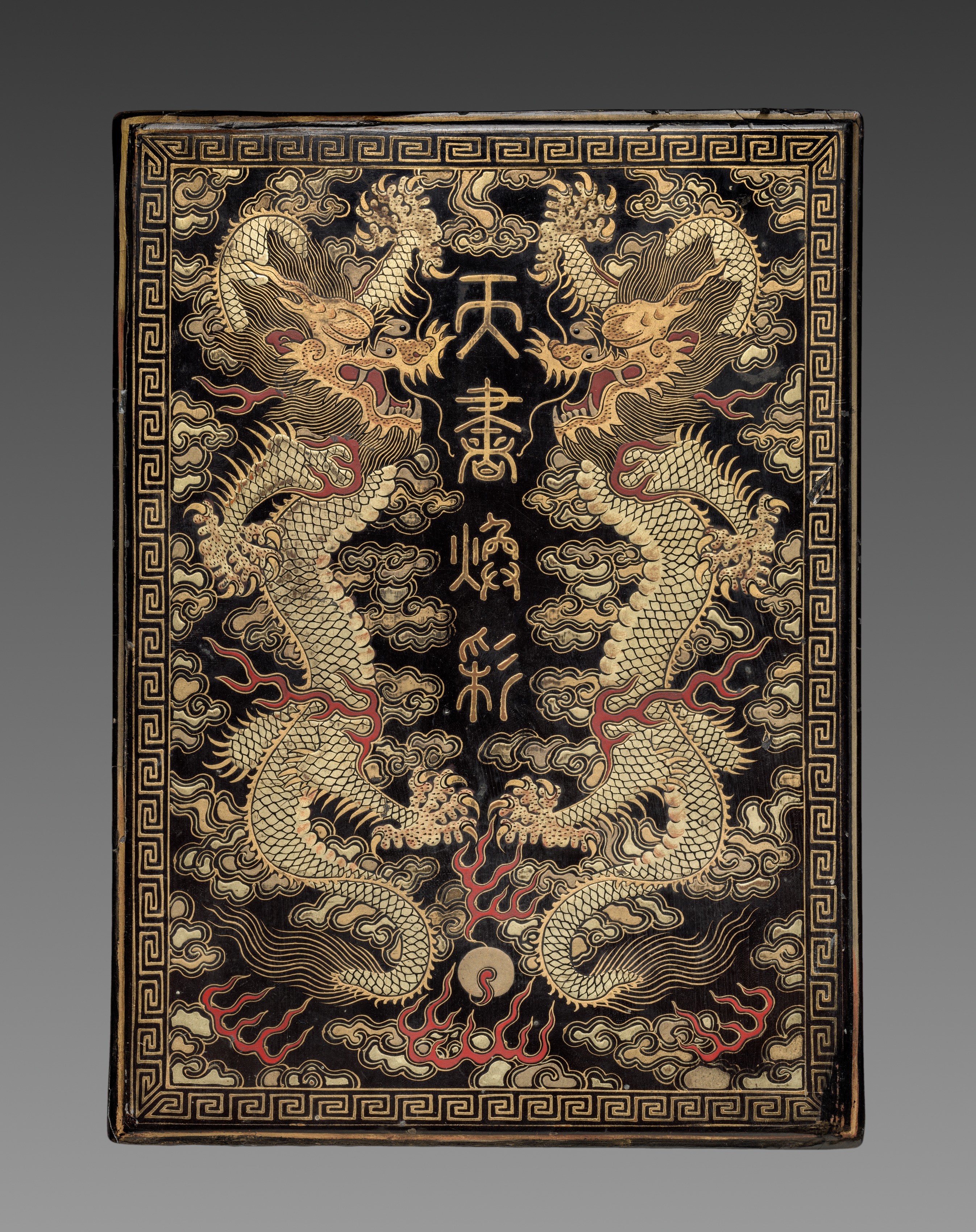 Black rectangular box with a lid; the lid features a Greek key gold border; gold and red dragons; gold Chinese characters; swirling clouds on a black background. Box with Ink Cakes (lid) by Unknown.